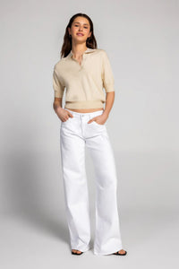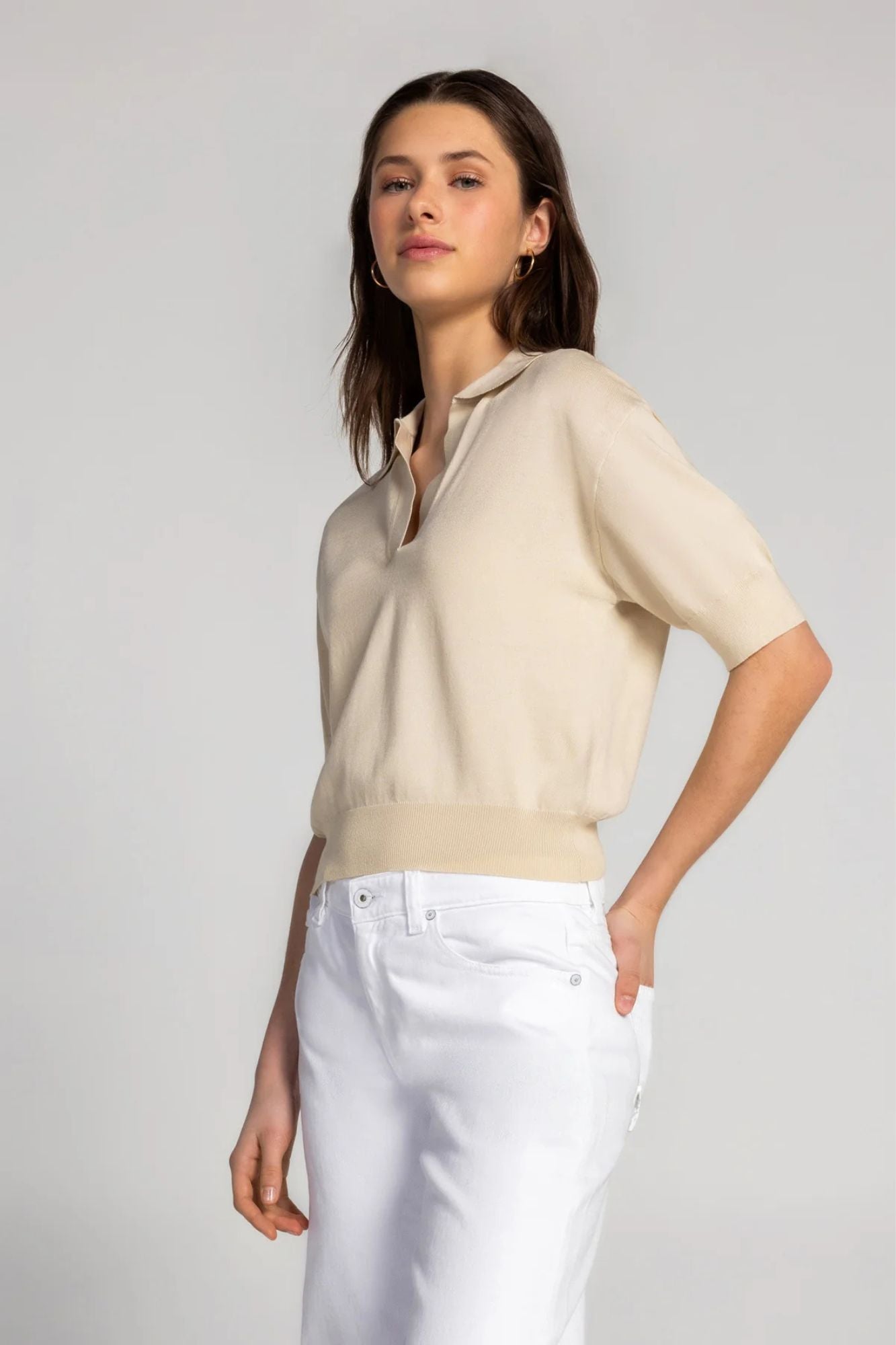 This long-sleeved ribbed polo redefines comfort and style with its relaxed, modern fit and deep V neckline, free of buttons for a sleek look. Made from ultra-soft, stretch knit fabric, it ensures cozy wear whether you're lounging at home or stepping out. Easily pair it with wide-leg trousers or tailored shorts to create versatile, polished outfits that transition effortlessly from casual to chic. Elevate your wardrobe with this must-have piece that combines comfort and sophistication.