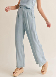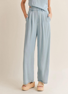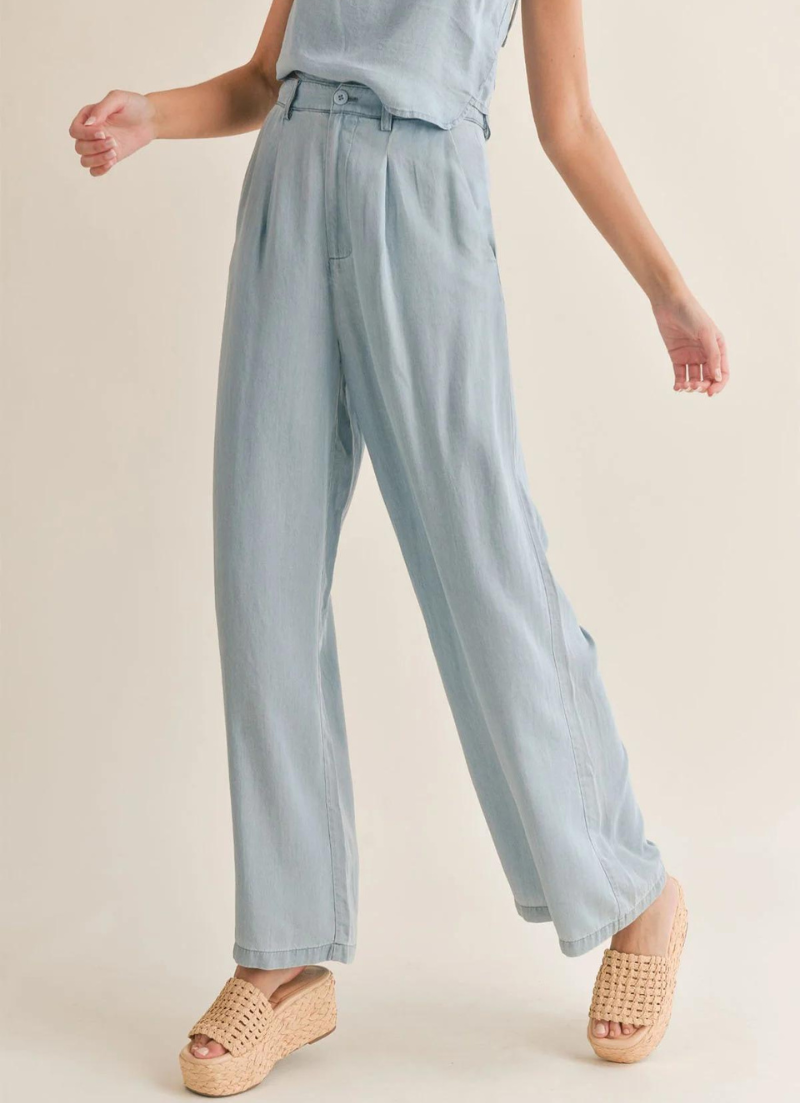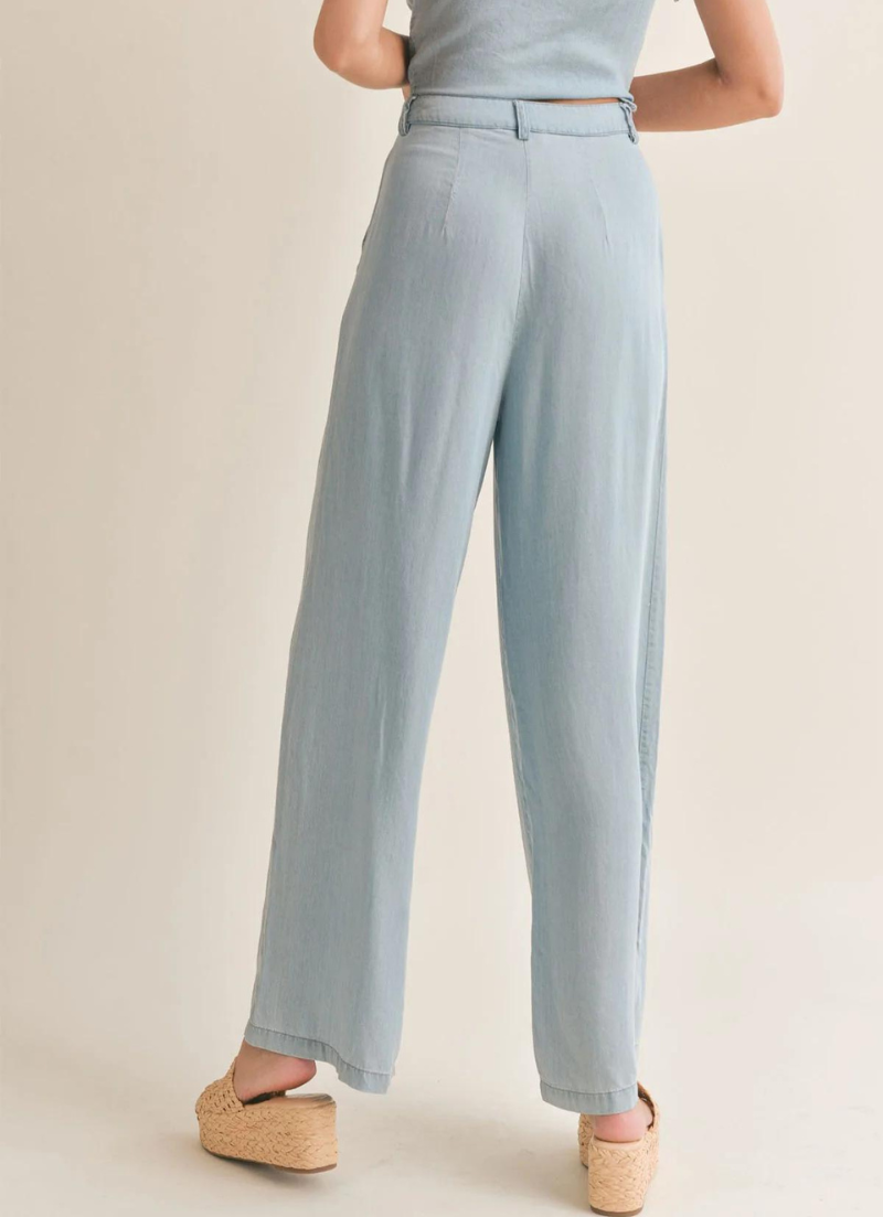 Upgrade your pant game with the Soft Breeze Chambray Pant. Comfortable and chic, this full length pant brings the cool feeling of a soft breeze to your wardrobe. Perfect for any occasion, dress them up or down for effortless style.