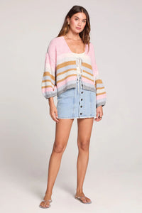 Soft multi-colored stripes bring instant joy to the Kiah Sweater, a playful yet polished layering piece. The scoop neck and dramatic 3/4 length gigot sleeves create a flattering, fashion-forward silhouette that works beautifully over basics for a pop of color or worn solo as your statement piece. Perfect for adding personality to any wardrobe.
