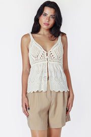 Ce haut en tricot léger arrive près de la taille, présente un détail torsadé en bas et un petit bouton-pression à hauteur de poitrine.