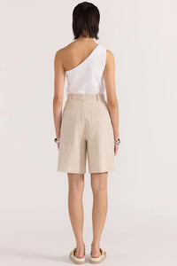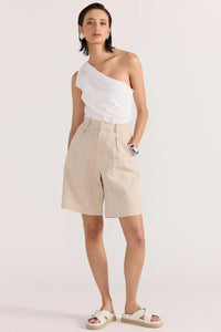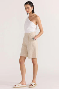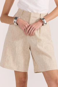 Elevate your warm-weather wardrobe with the Mason Longline Shorts. Crafted from a breathable linen blend, these high-rise shorts offer both sophistication and comfort for any occasion. The elegant pintuck front and concealed fly zipper create a sleek silhouette, while practical side and back pockets add functionality without compromising style. Perfect for transitioning between seasons, these versatile shorts will quickly become your go-to favorite.