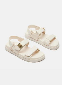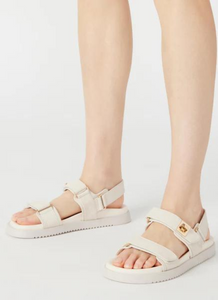 The Mona takes the classic three-strap sandal design with a molded footbed and a flat sole and elevates it with a leather construction and substantial gold tone hardware.