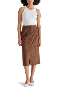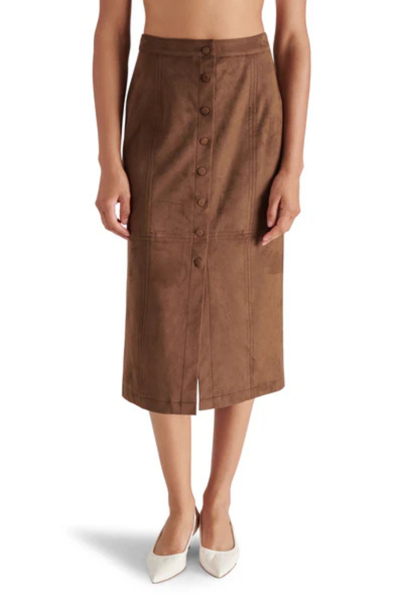 Experience refined style with the Riya Midi Skirt. This faux-suede paneled skirt features a covered button front and classic midi length. Its timeless design adds sophistication to any outfit while its soft texture provides comfort. Elevate your wardrobe with this elegant and versatile piece.