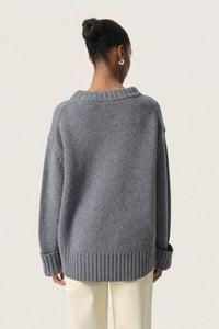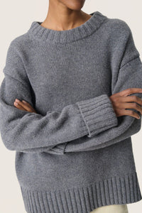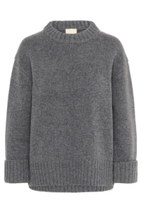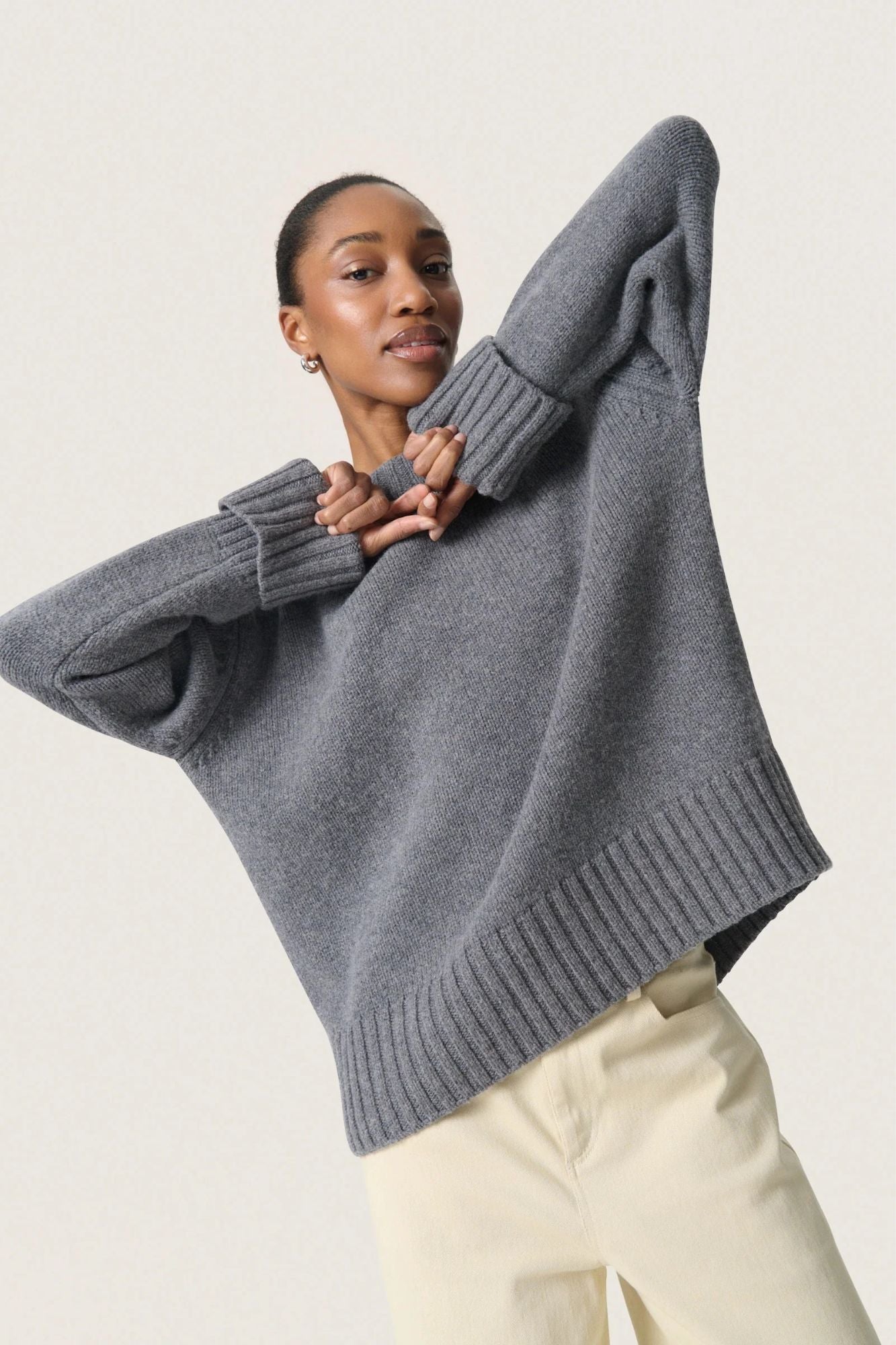 The Moline Sweater offers cozy comfort with its soft, 100% wool knit in a stylish mottled grey. Its relaxed fit and dropped shoulders create an effortlessly oversized look, perfect for layering on cooler days. Featuring wide ribbed trims and a classic round neckline, this sweater combines warmth and style for your everyday wardrobe.