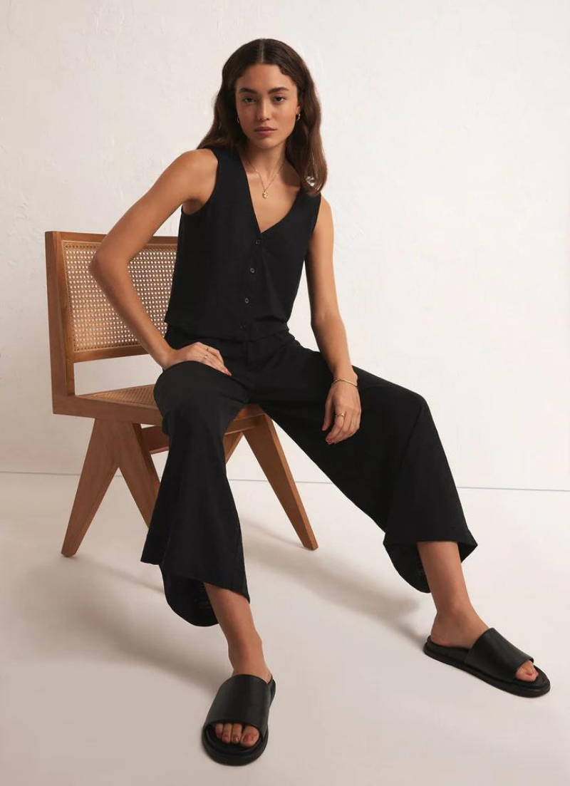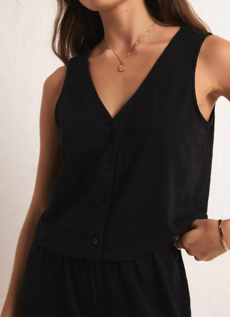 When you're looking for a style that can go from professional to picnic in the park. This elevated textured slub button-front top features a sleeveless v-neck design and flattering relaxed fit. Model is 5′11″ wearing size S.