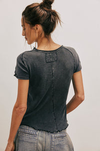 The Be My Baby Tee offers a flattering, slightly fitted silhouette with a trendy cropped length. Crafted from lightweight, soft fabric, it ensures all-day comfort. Its scoop neckline and delicate lettuce-edge trim add subtle feminine details, while exposed seaming gives it a modern edge. Perfect for effortless style that feels as good as it looks.