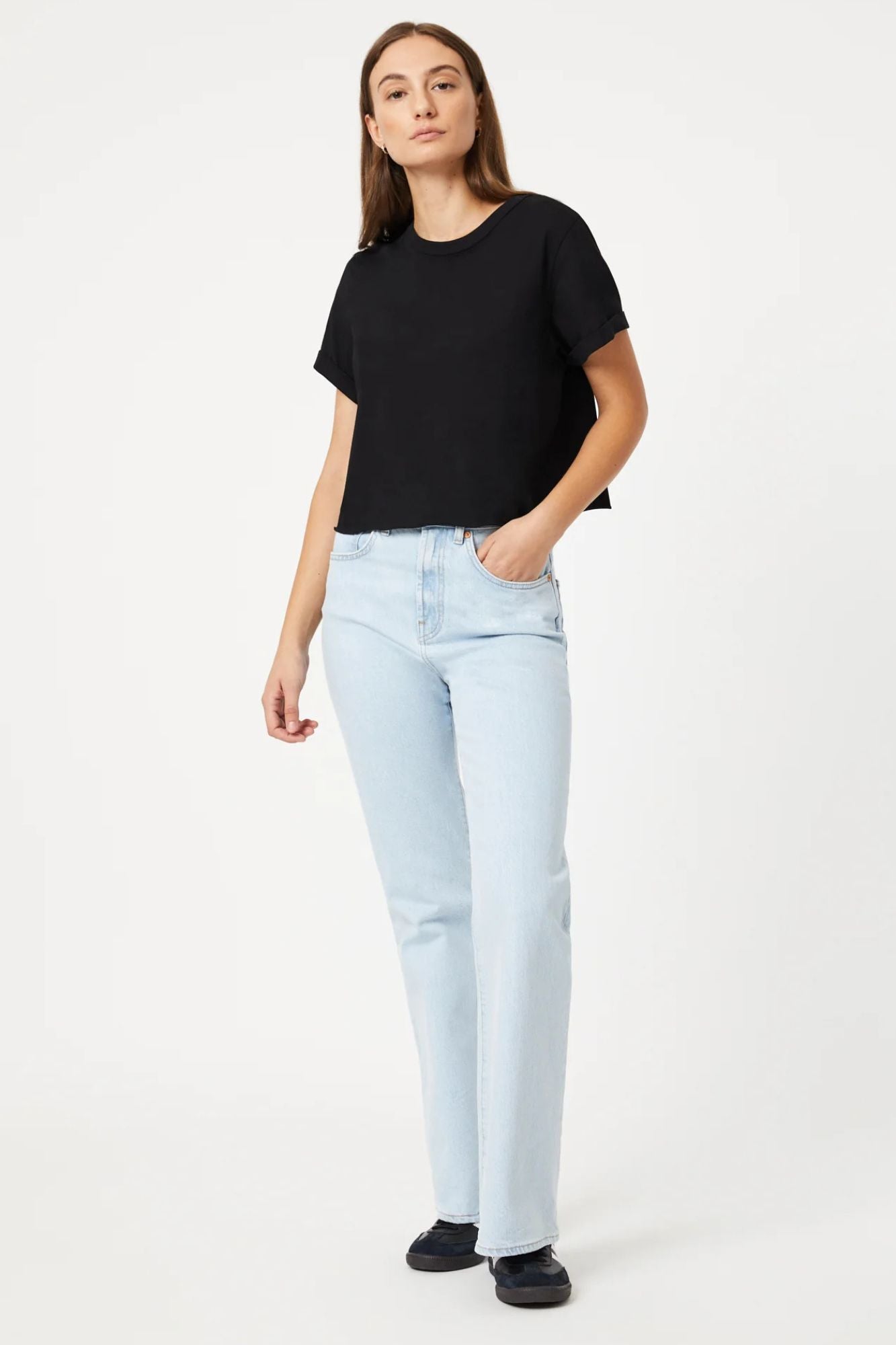 This basic crew neck t-shirt offers a stylish, versatile look with its slightly cropped and boxy fit. Perfect for layering with denim or shorts, it's a must-have for any wardrobe.