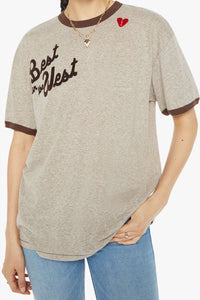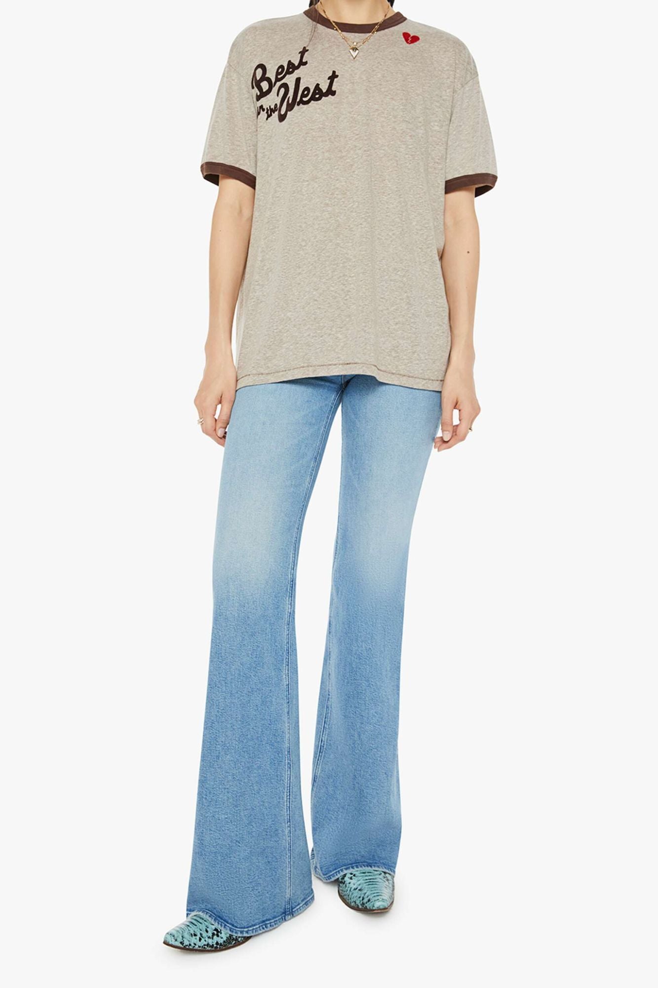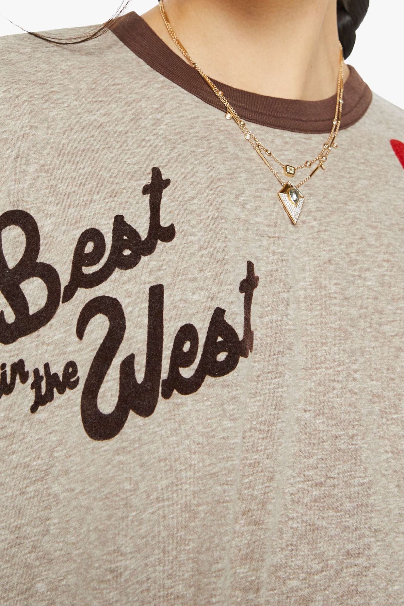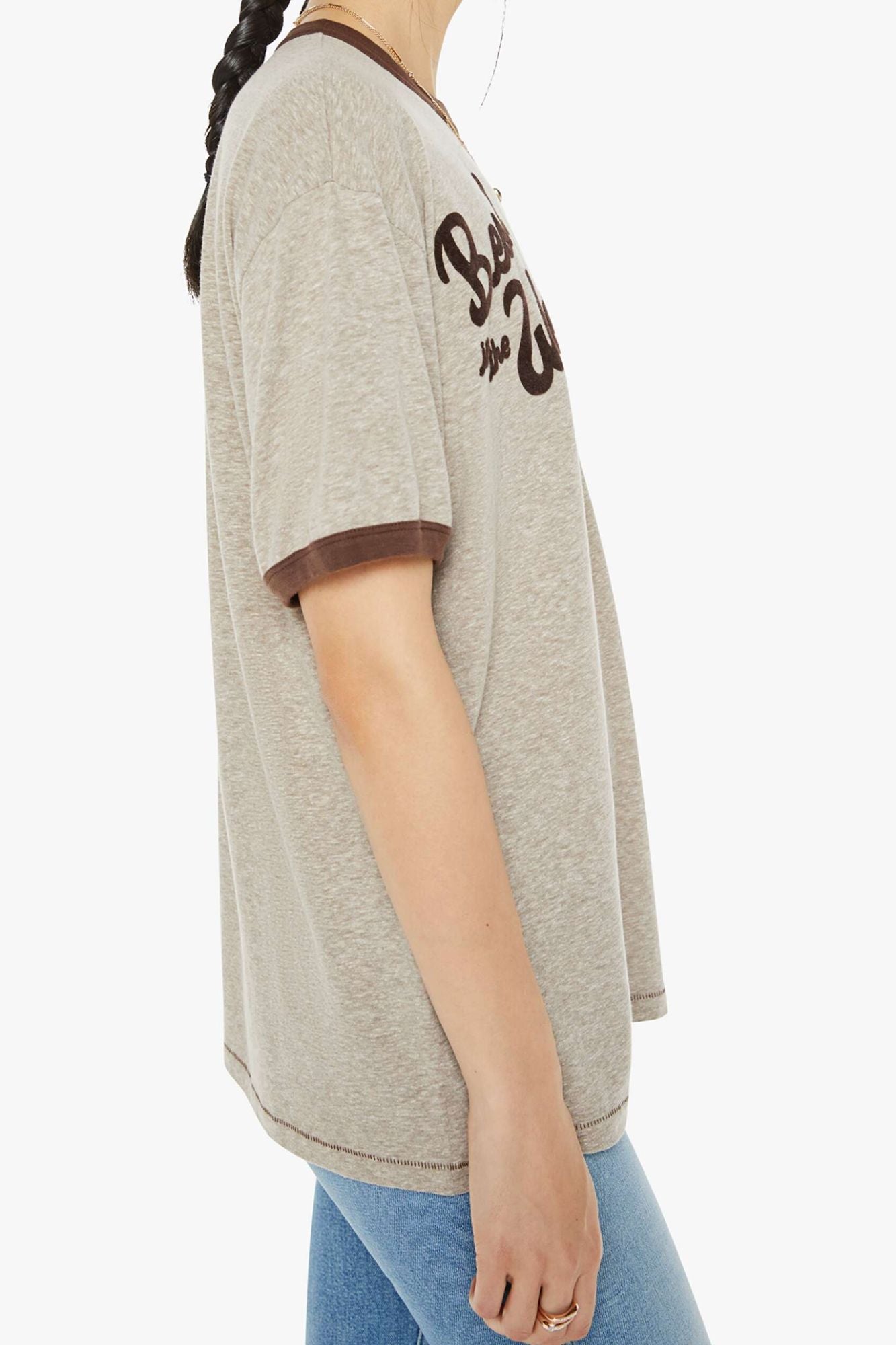 The Lowdown Ringer is the perfect choice for any rodeo queen. Its oversized design, drop shoulders, and loose fit provide both comfort and style. Made from a cotton blend in marled tan with brown trim, this tee features a bold red heart near the collar and bold text on the chest and back. Show off your love for riding with The Lowdown Ringer.