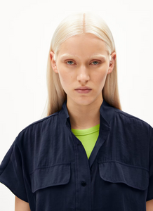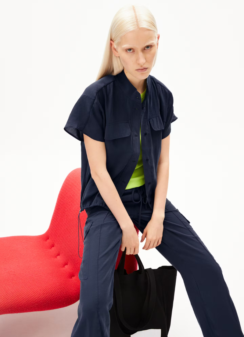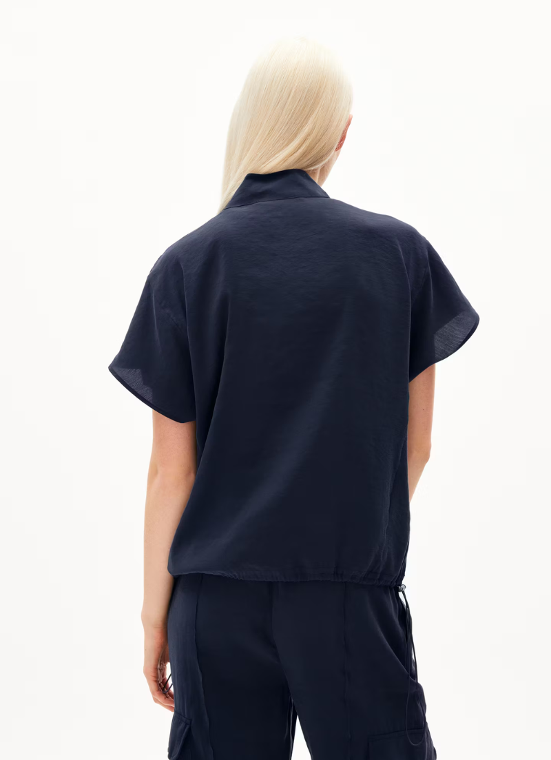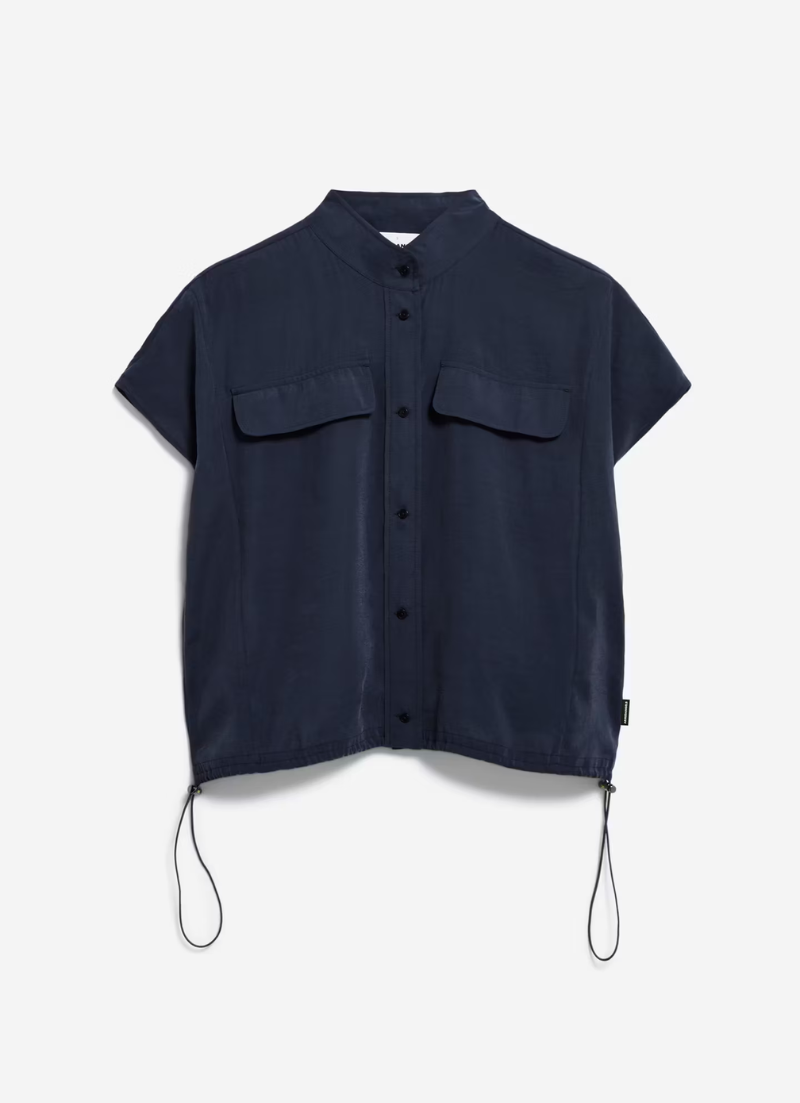 Stand out in style with the Bahareh blouse. This quirky top features a unique stand-up collar and an elastic waist for a flattering fit. The button placket closure adds a touch of sophistication, while the patched pocket adds a fun and functional detail. Pair with any bottom for a chic and playful look. The model is 179 cm tall and is wearing size S.