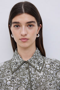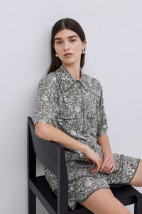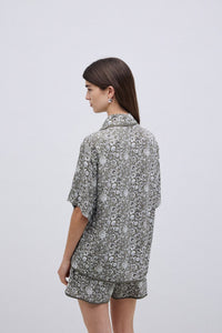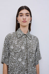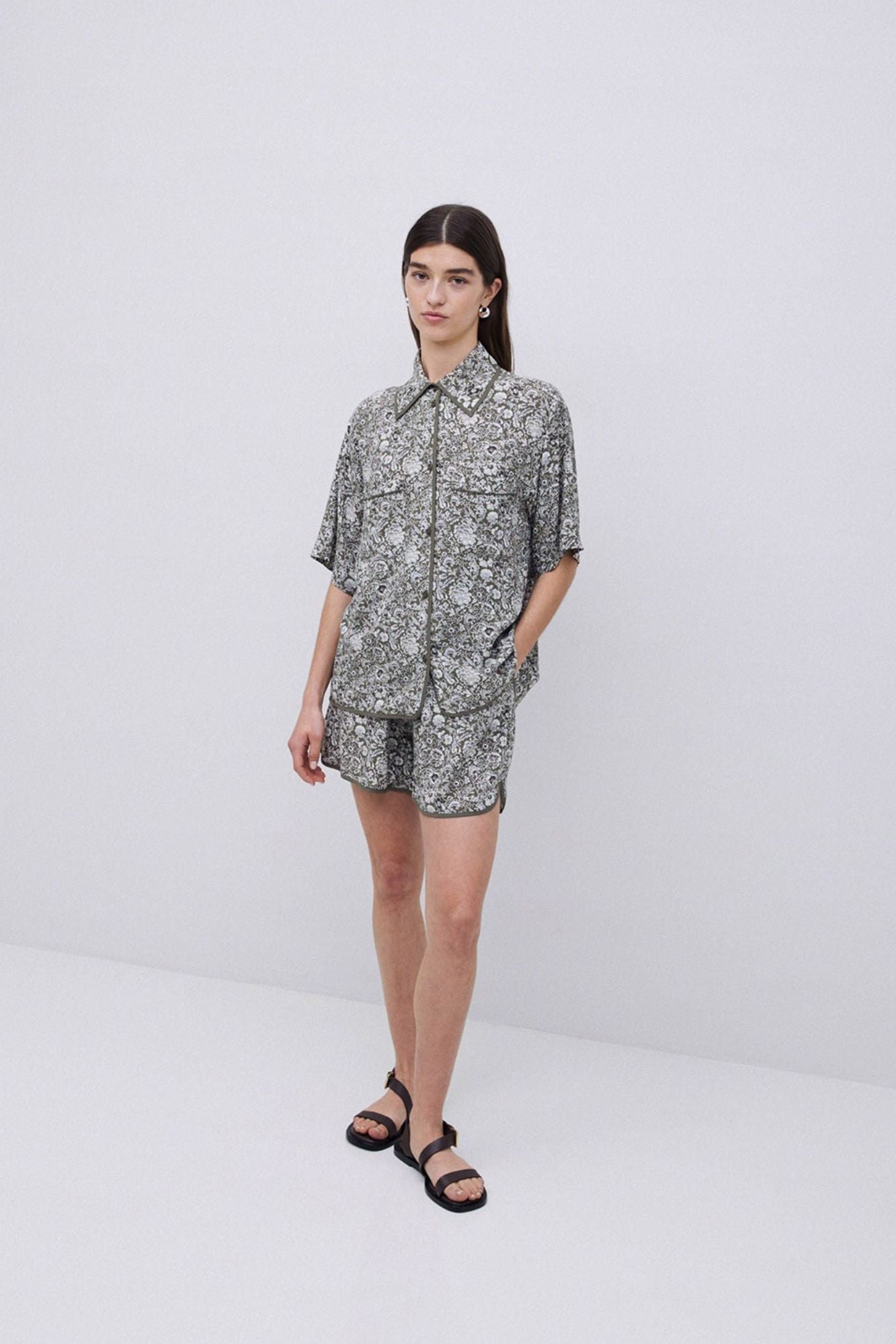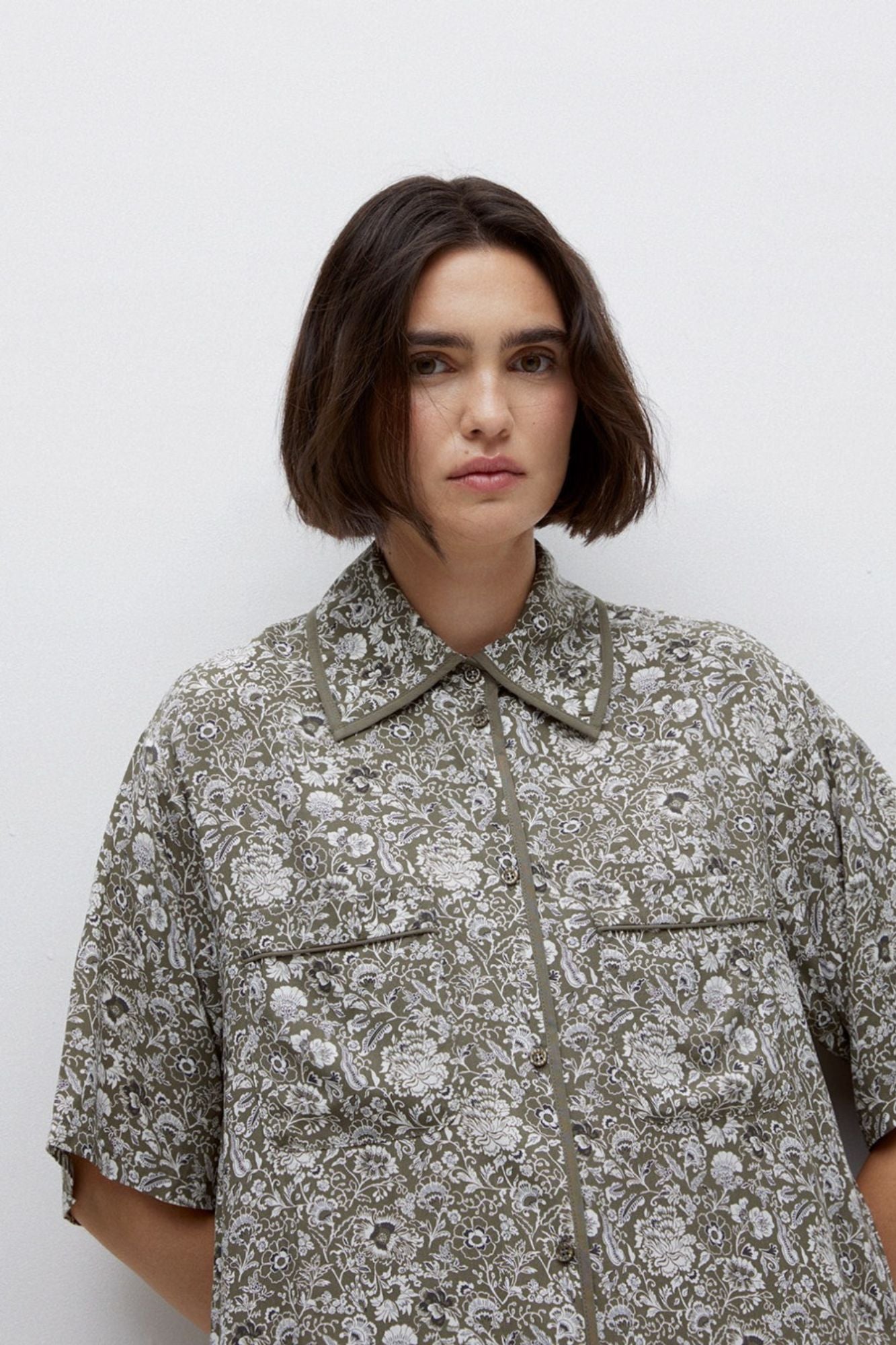 This khaki floral flowy shirt combines comfort and style with its lightweight 100% Ecovero viscose fabric. Featuring a charming floral print, a classic collar, and short sleeves, it offers a breezy fit perfect for warm days. The button closure and contrast piping add refined details, while two chest patch pockets provide practical flair. Elevate your wardrobe with this effortlessly elegant piece.
