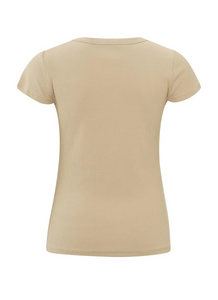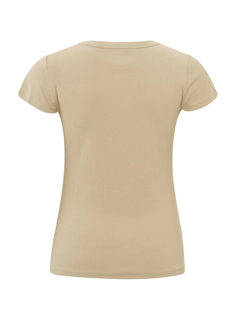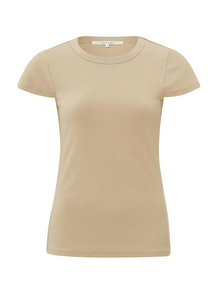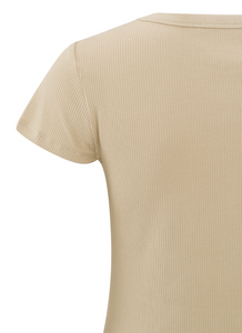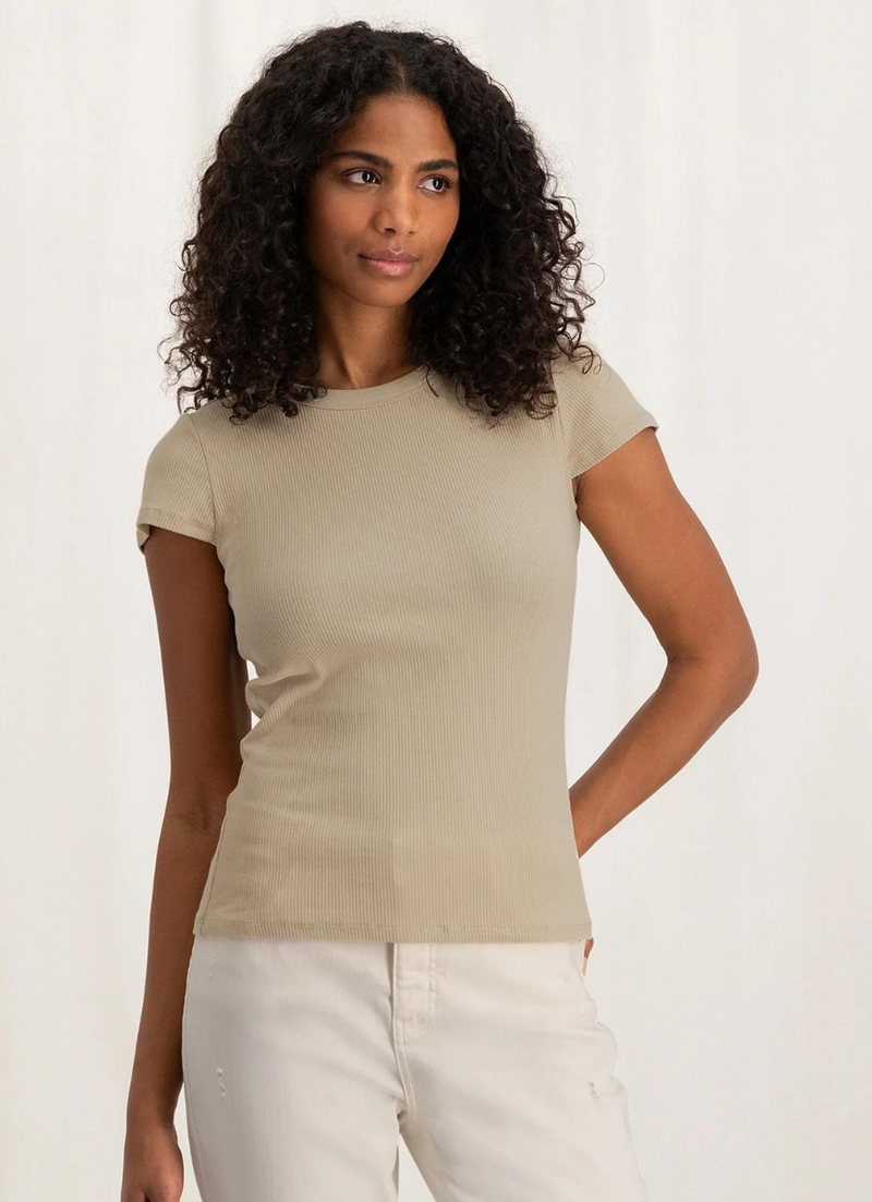 The Melanie Top is a playful twist on the classic T-shirt. Made of soft cotton and featuring a slim ribbed fit, this top is designed with a round neck and cap sleeves for a flattering and comfortable look. Available in a range of sizes and colors, this top is a must-have for any stylish wardrobe. The model is 176cm and wears a size S.