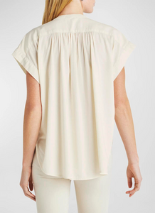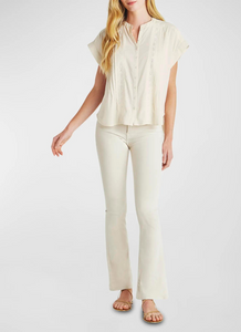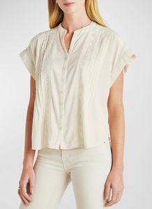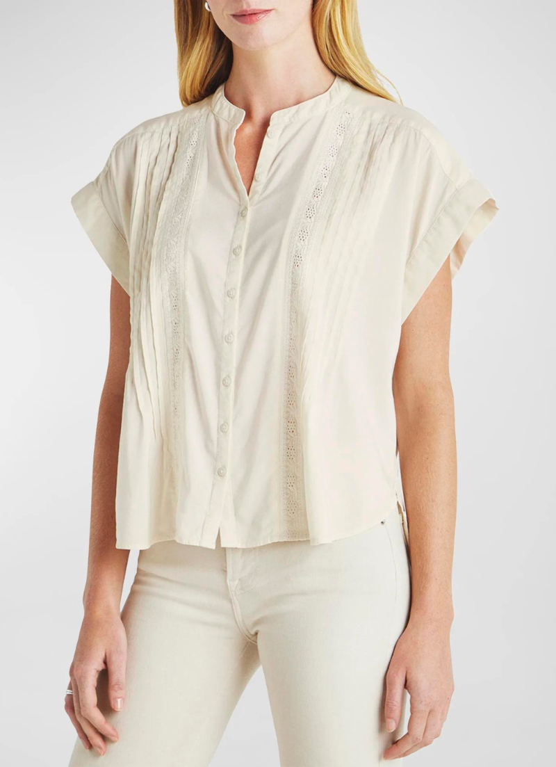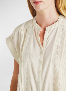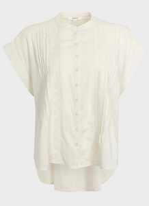 Get ready to turn heads in the Pamola Lace Moonstone blouse! With a woven front and delicate crochet trim inserts, this top is both chic and playful. Plus, it offers versatility in styling - wear it as is, tucked in, or tied in a knot. The high-low hem and pleated back add an oversized fit for a relaxed yet stylish look.