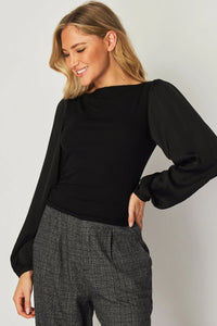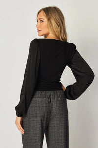 Indulge in luxury with our Ruched Waist Flowy Sleeve Top. The ribbed knit fabric offers comfort, while the satin flowy sleeves add a touch of glamour. Perfect for any occasion, this versatile top will elevate your wardrobe with its soft and elegant design.
