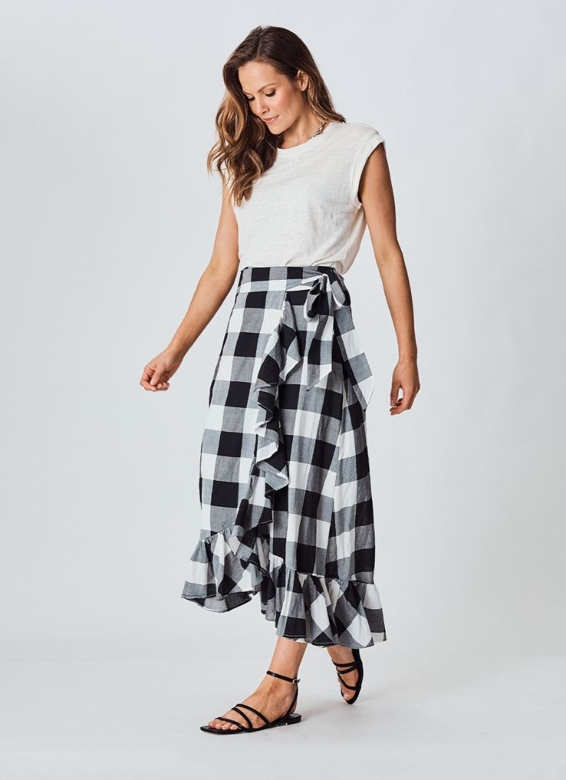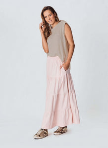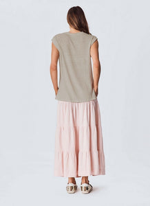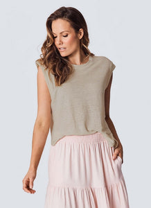 Ce débardeur incontournable présente une bande à chevrons le long de la nuque, une large bande au niveau du col et des emmanchures avec un ourlet asymétrique.