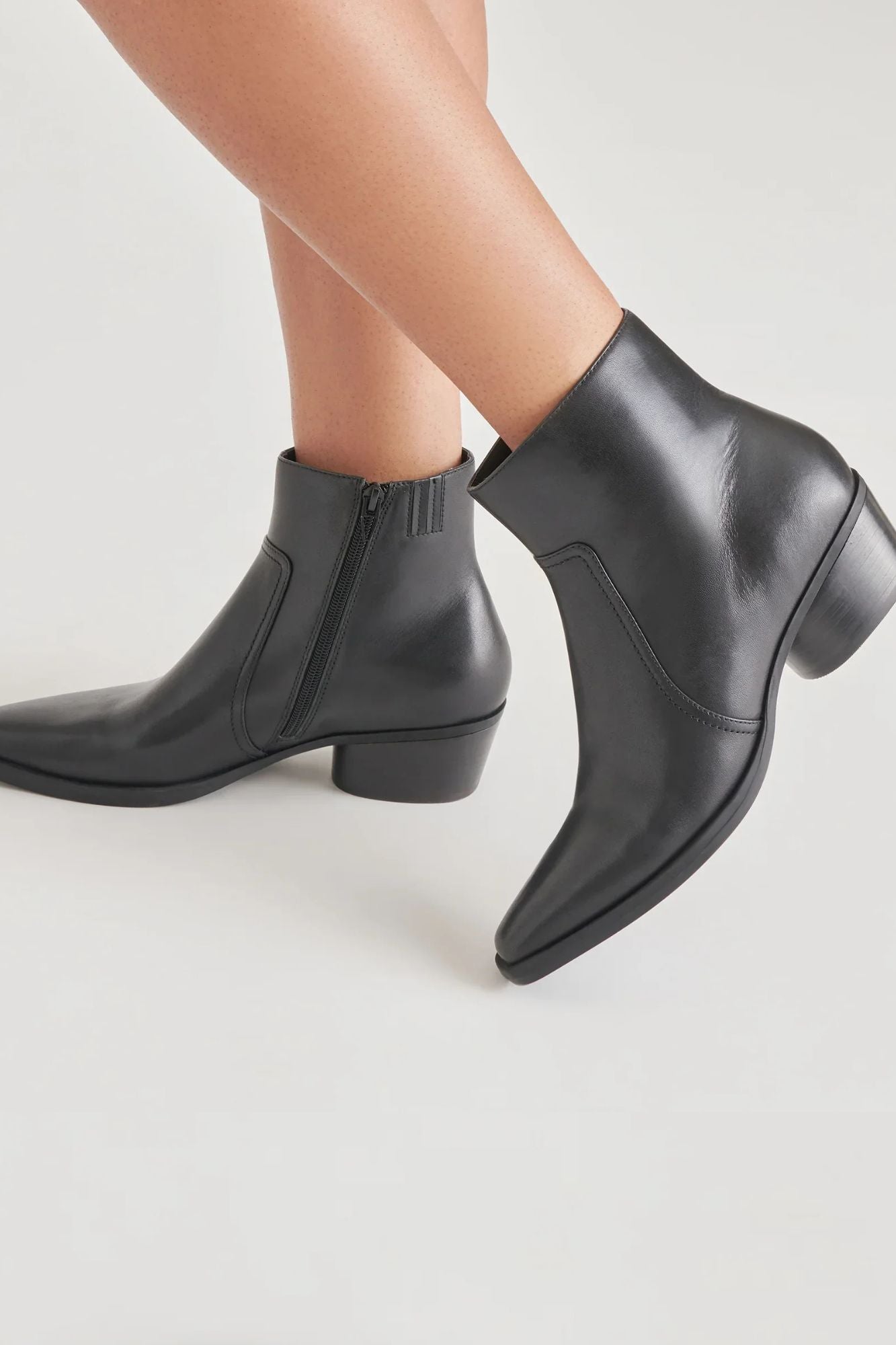 Introducing Fahari H2O, the chic and versatile bootie designed to conquer any day. Its sleek silhouette has a touch of western, while its sustainably-crafted design is unafraid of rain. Made with a water-based recycled leather alternative lining and sock, and complemented by a 1.5" heel height.