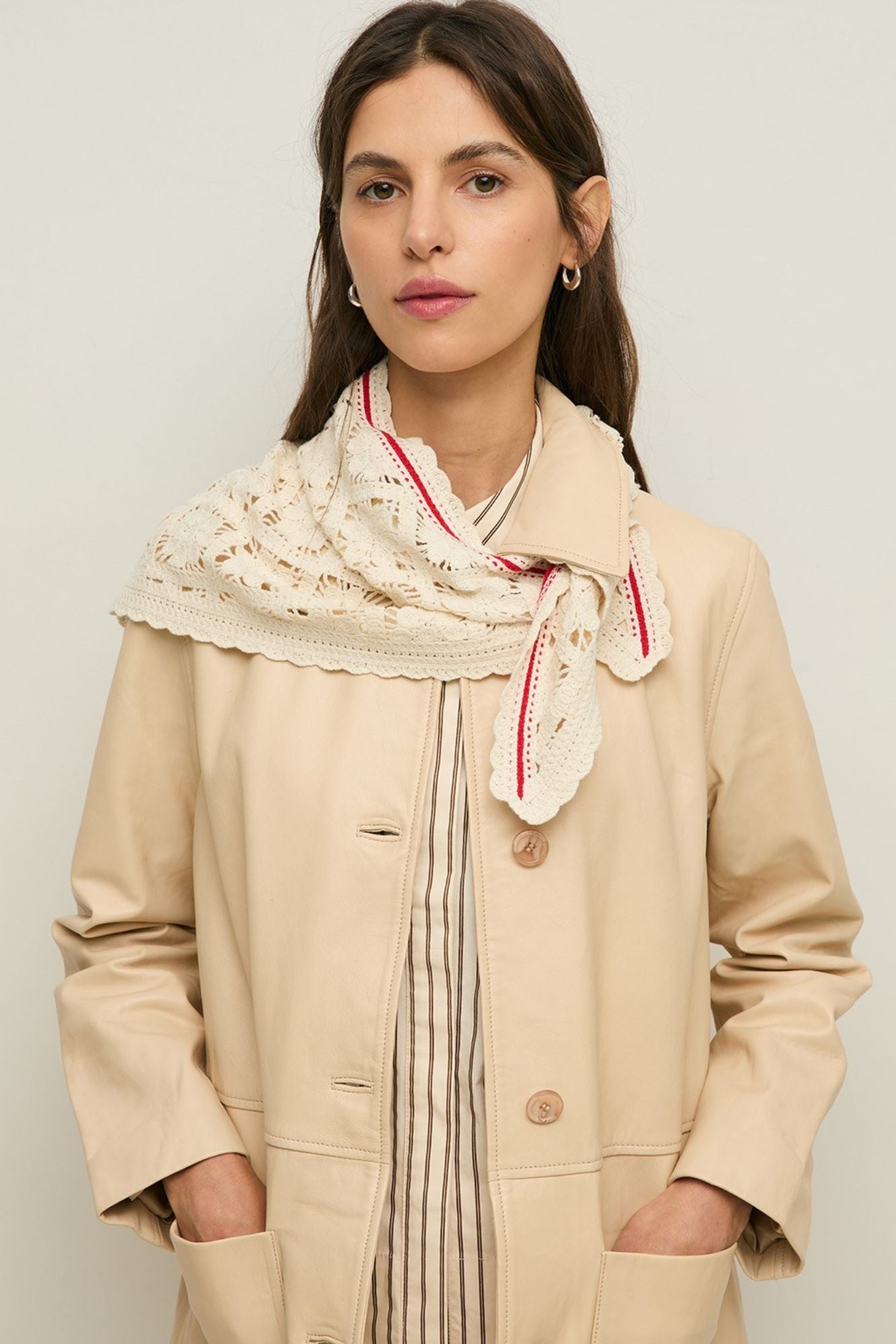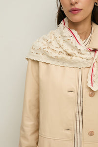 Wrap yourself in timeless elegance with this ecru crochet shawl, featuring a graceful triangular silhouette perfect for layering. The delicate handcrafted texture is beautifully accented with contrasting trim that adds visual interest and definition. Ideal for cool evenings or as a versatile accessory, this piece combines comfort with understated sophistication. A wardrobe essential that transitions effortlessly from casual to refined occasions.