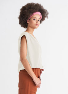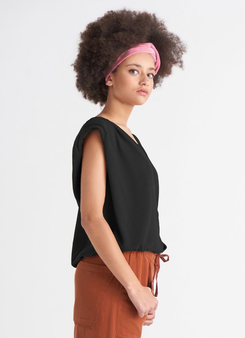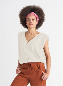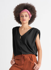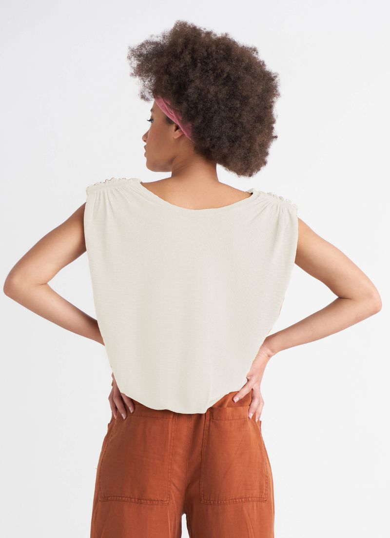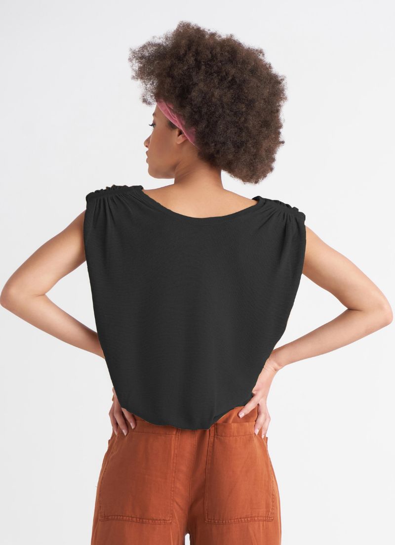 Ce haut sans manches présente des épaules rembourrées froncées et un bouton sur le devant.