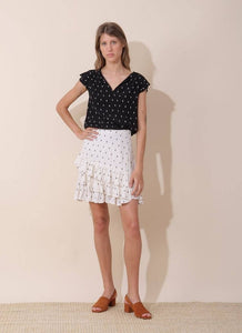 La jupe Diamond est une jupe courte qui arrive au-dessus du genou. Avec un ourlet à plusieurs niveaux et à volants. Associez-le au chemisier Diamond pour un ensemble contrasté mais assorti.