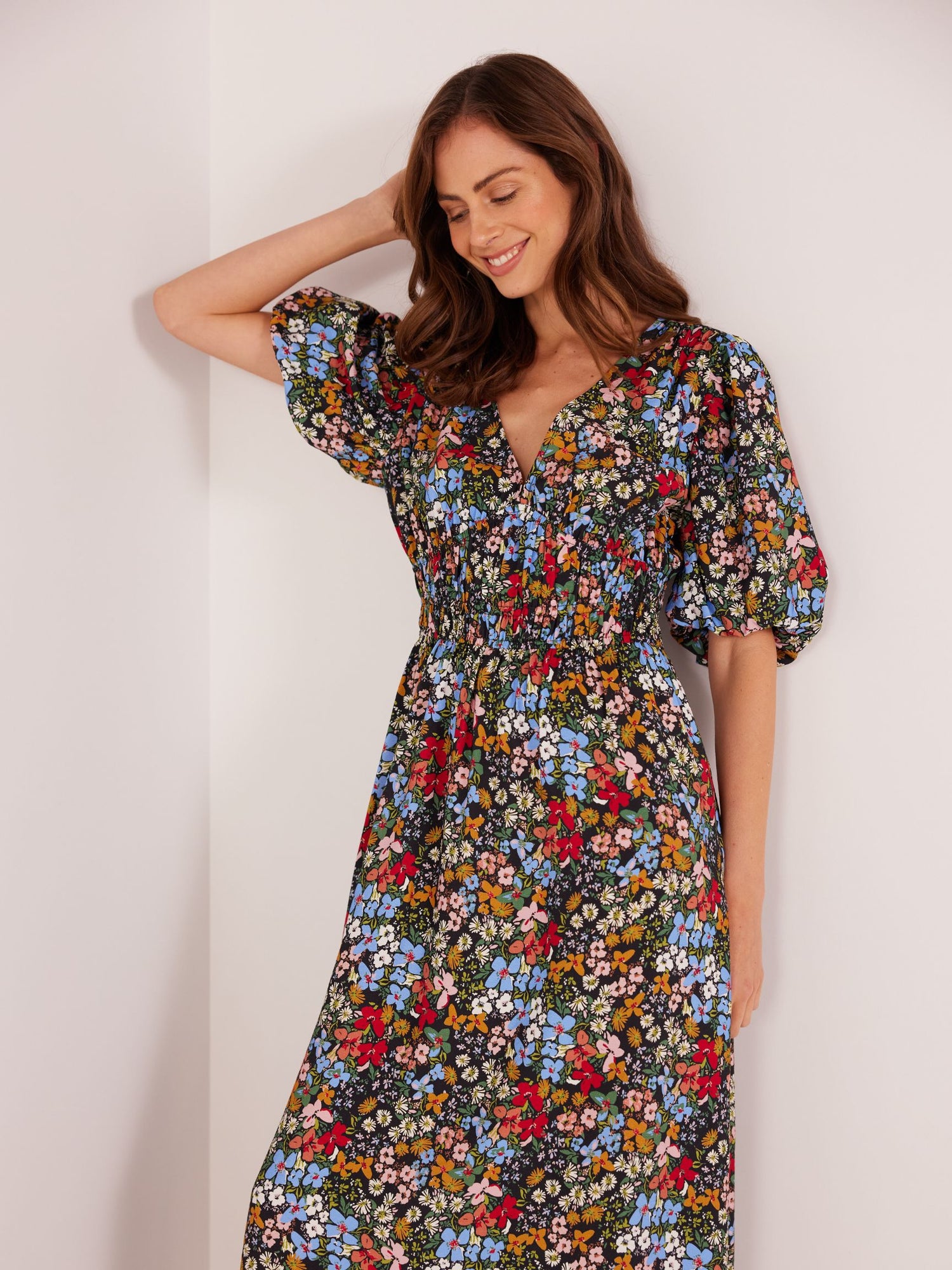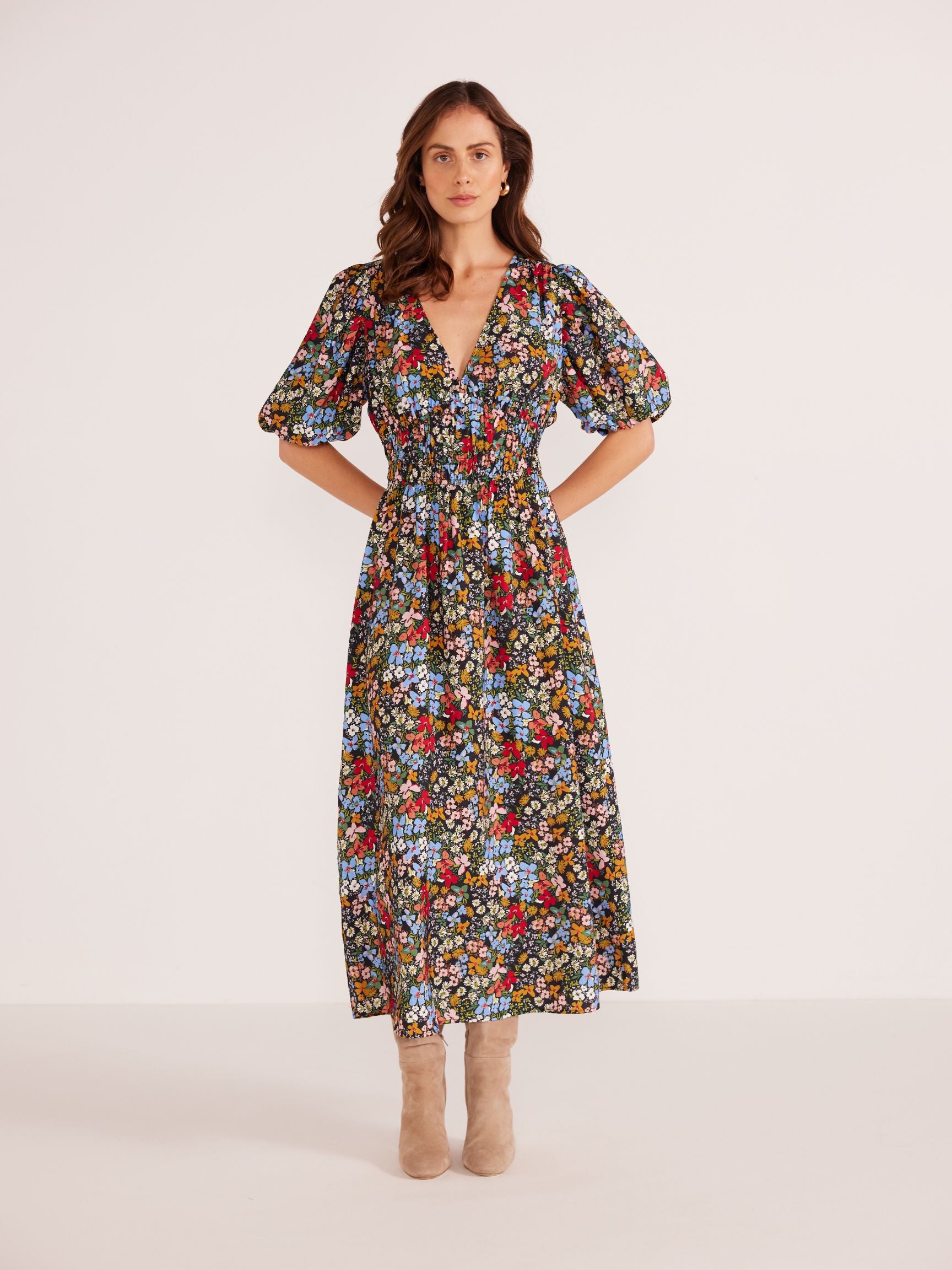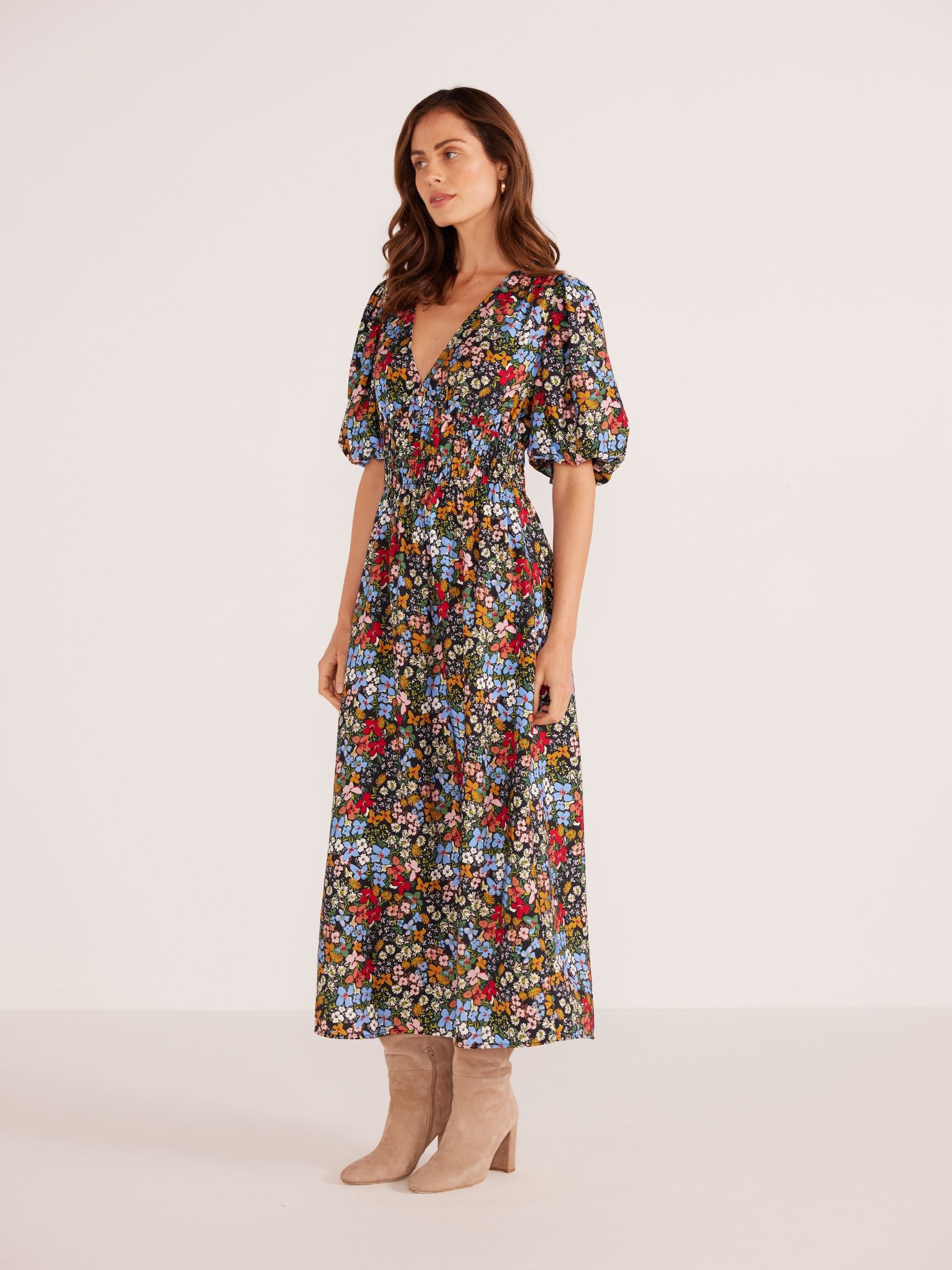 The Josie Puff Sleeve Midi Dress combines fun and elegance with its playful puffed long sleeves and flirty V neck. The floral pattern adds a touch of whimsy, making this dress perfect for any occasion. Dress it up or down for a versatile and chic look.