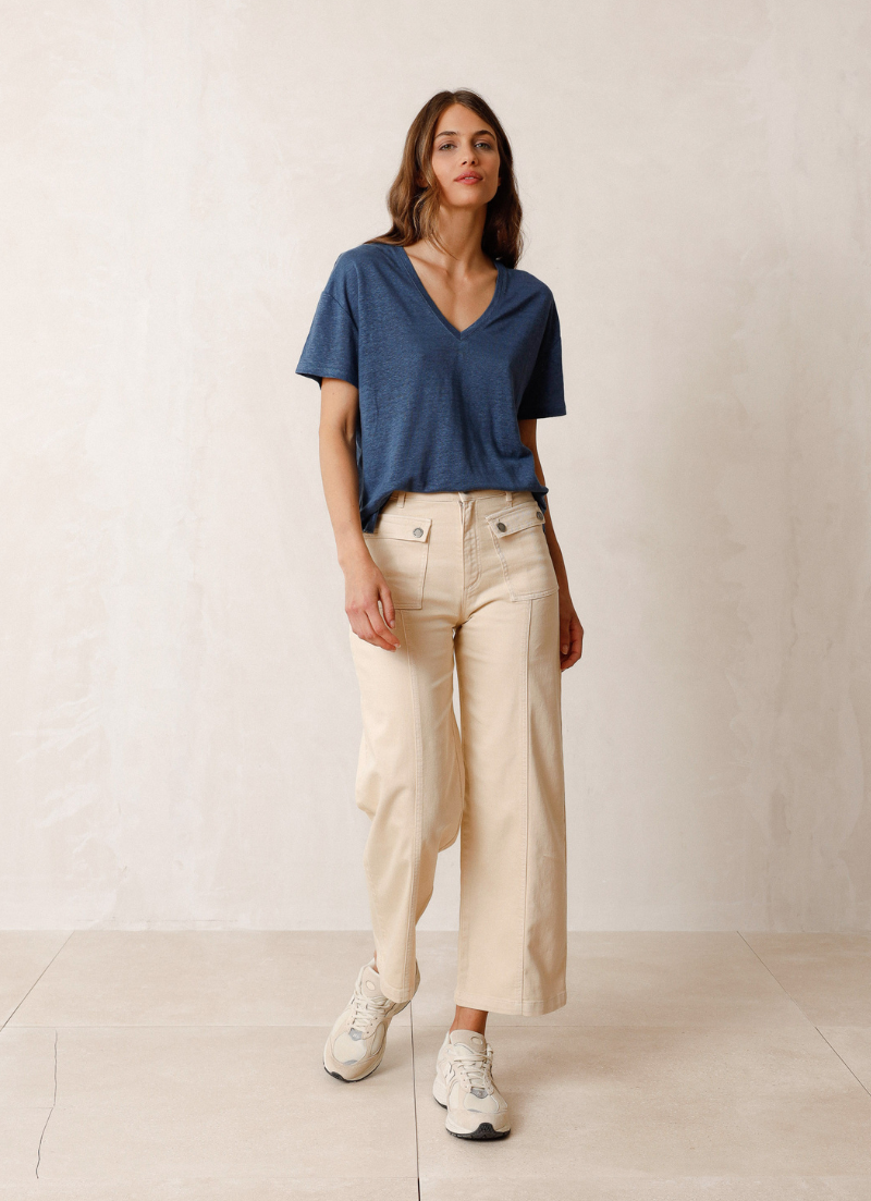 La base de toutes les bases. Un T-shirt à col V en lin, mais avec ces touches différentes qui vous font choisir celui-ci plutôt que tous les autres. Son col en V, sa coupe droite et sa coupe slim en feront votre t-shirt incontournable.