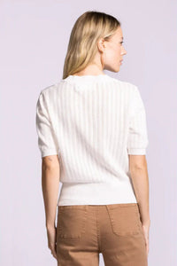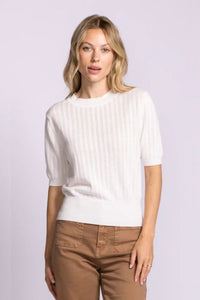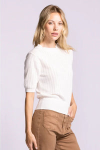 The Santa Barbara Sweater is a charming short-sleeve essential crafted from soft pointelle knit. Delicate eyelets arranged in neat lines create an airy, textured aesthetic perfect for layering or wearing solo. A gentle ruffle trims the crew neckline, while puffed sleeves taper into snug ribbed cuffs for a flattering silhouette. The fitted ribbed hem and subtle waist cinching complete this versatile wardrobe staple with effortless elegance.