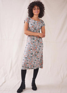 La robe Aiken Jersey est une robe midi fabriquée de manière durable avec une encolure ronde, une taille cousue avec des pinces vers le buste. Avec un motif de mandala abstrait partout et une forme de ligne A.