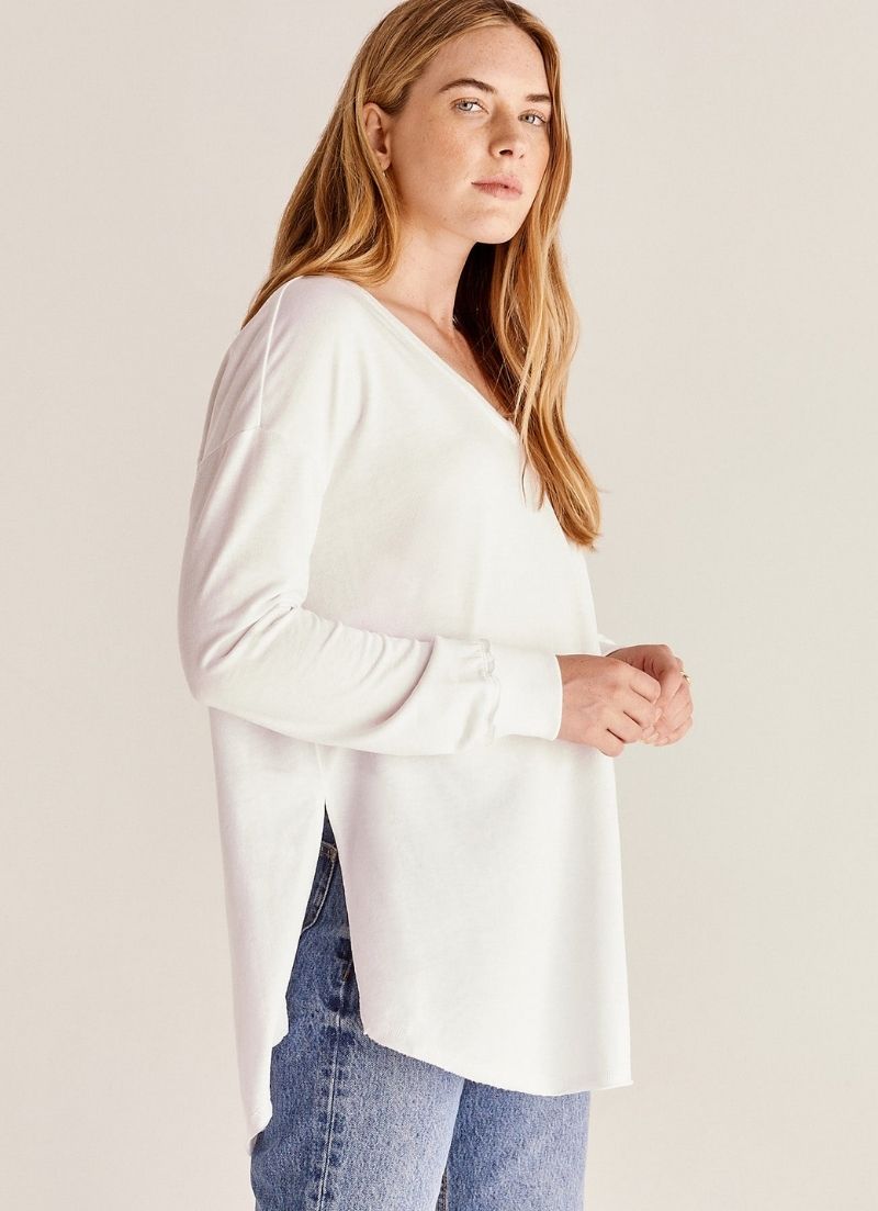Le haut V Neck Weekender présente un design surdimensionné très apprécié, un décolleté en V flatteur, avec des fentes latérales exagérées et un ourlet brut avec des accents côtelés.