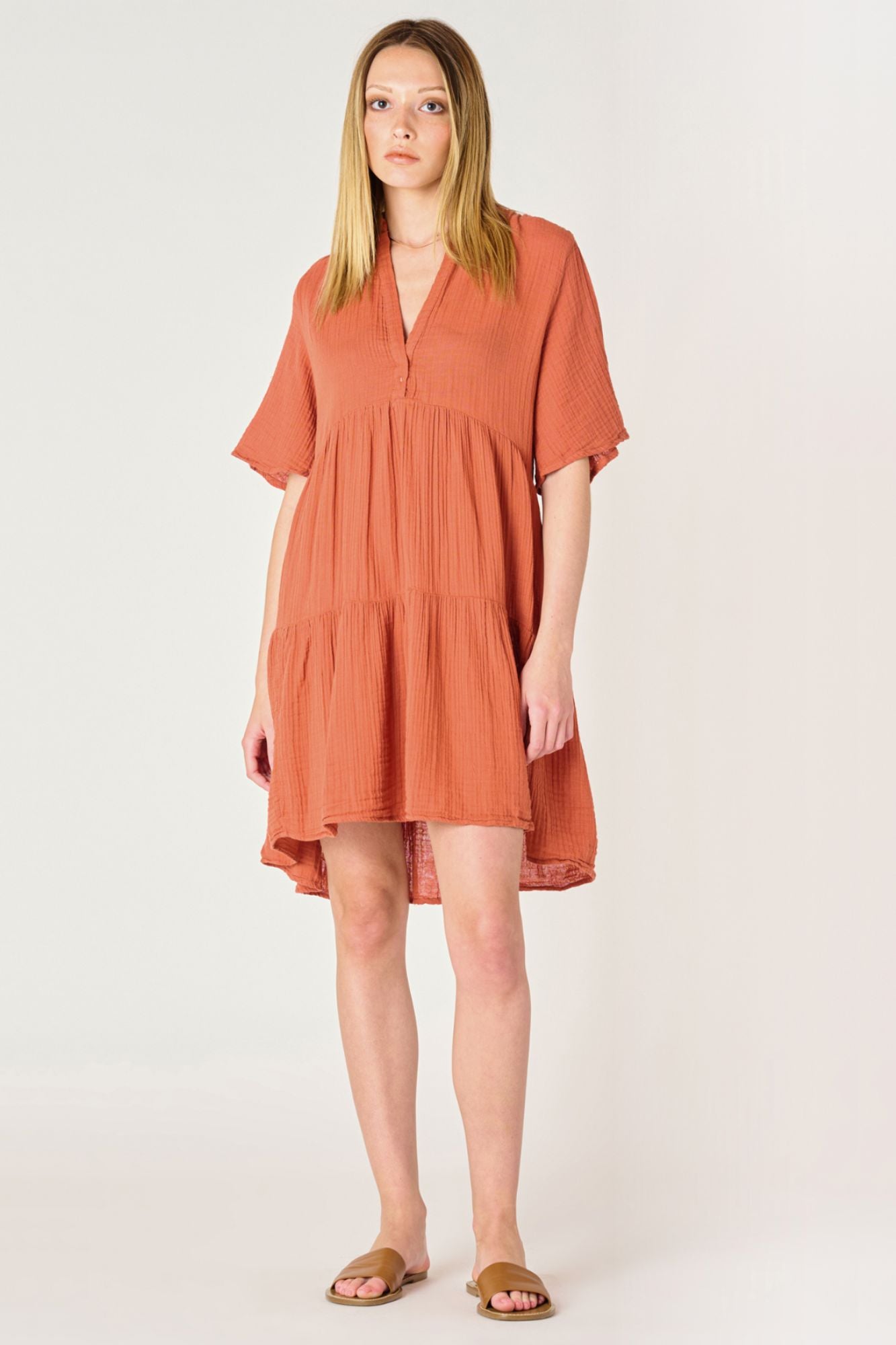 Add a touch of whimsy to your wardrobe with the Ada Tiered Mini Dress. Made from flowy gauze cotton, this V-neck dress features tiered layers for a playful silhouette. Perfect for any occasion, it's sure to become your go-to choice for effortless style (and twirls!).