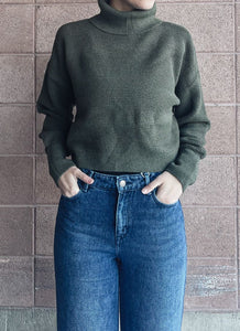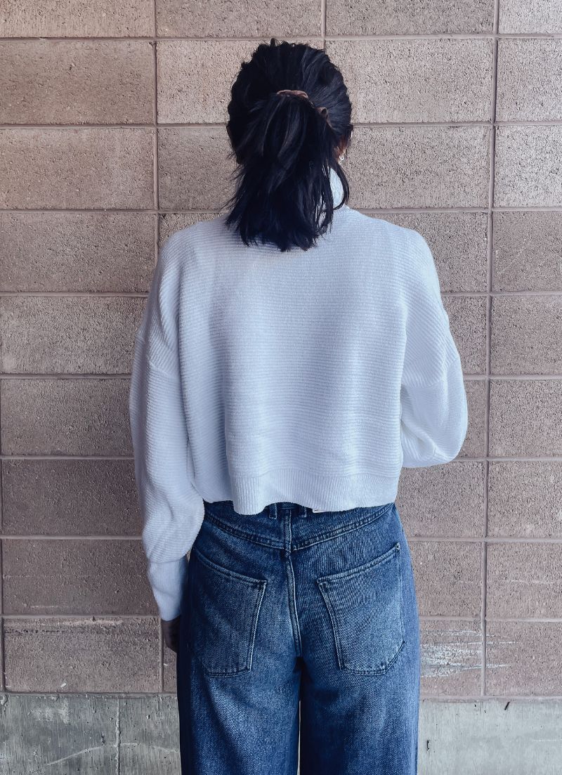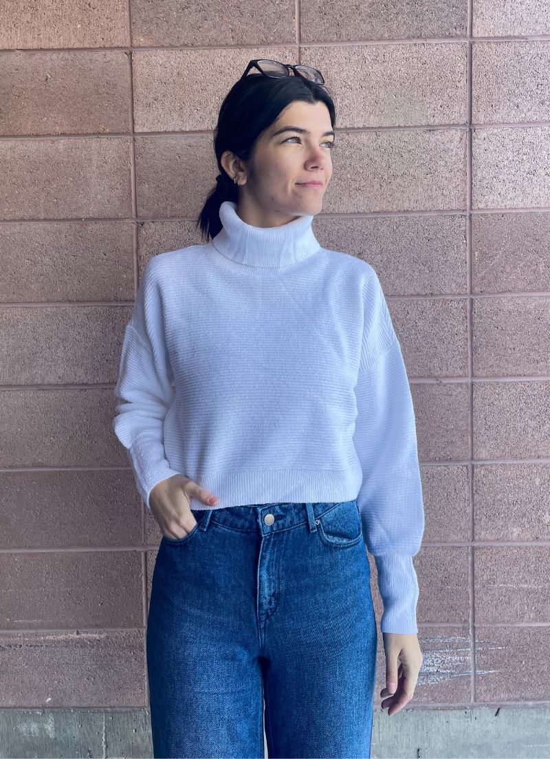 Addison is a lightweight cropped sweater with a turtleneck and rib detailing all over. Looks perfect with high waist jeans!