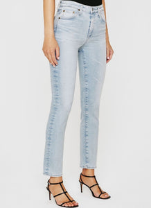 The Prima Crop Cigarette Jean for women features an authentic, 26-year ultra light denim wash that’s been uniquely washed-down and faded to mimic a genuine pair of vintage jeans.. The Prima Crop is cut with a fitted silhouette through the hips, slight tapering at the leg, and is finished with a cropped hem.