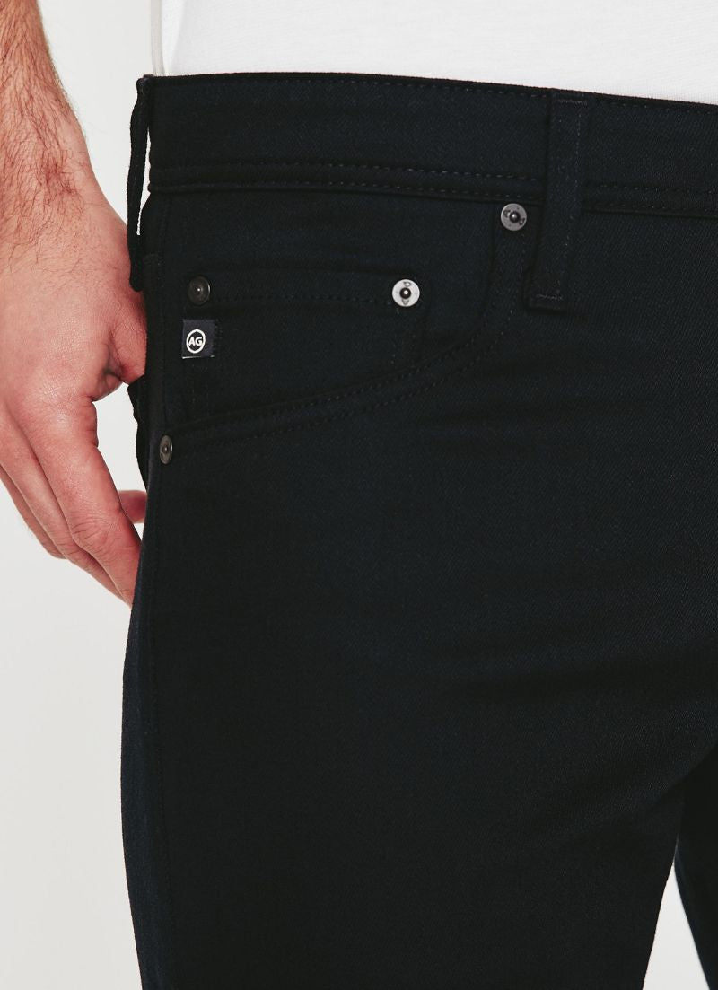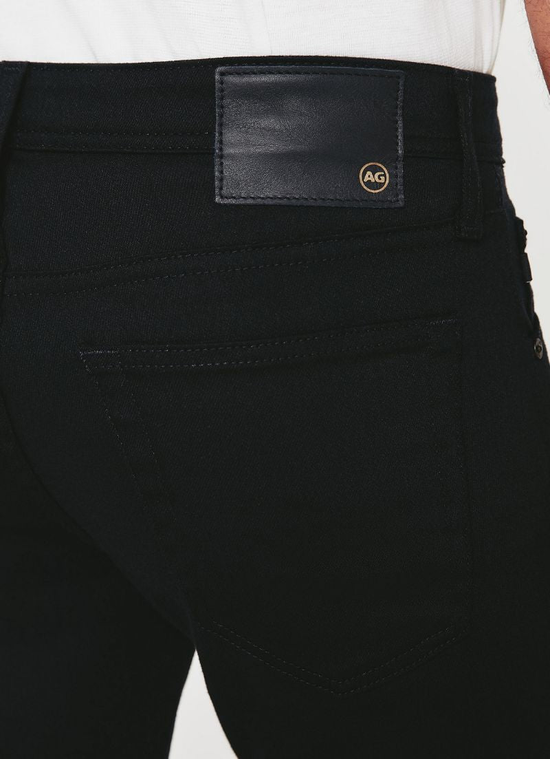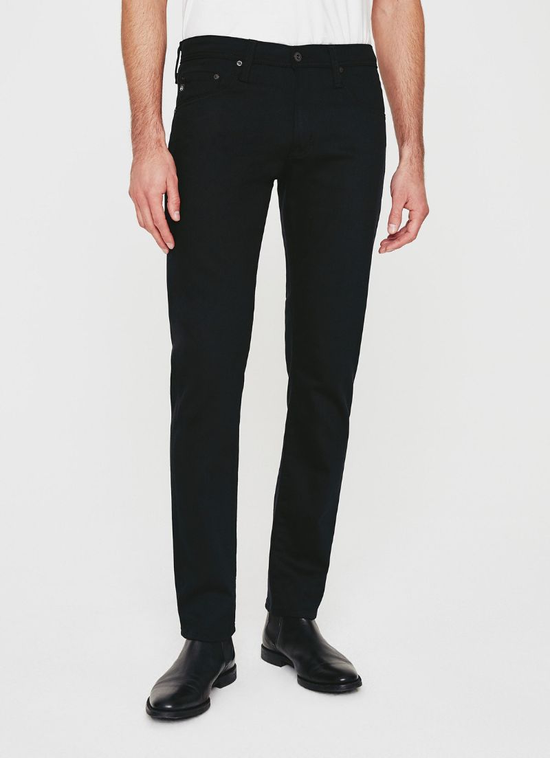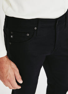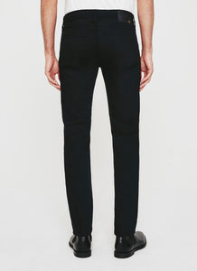 The Tellis modern slim jean for men features a fitted upper block and tapered leg opening—complete with a deep black hue.