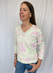 This sweater features a V neck and a subtle pink and lime watercolour camo print.