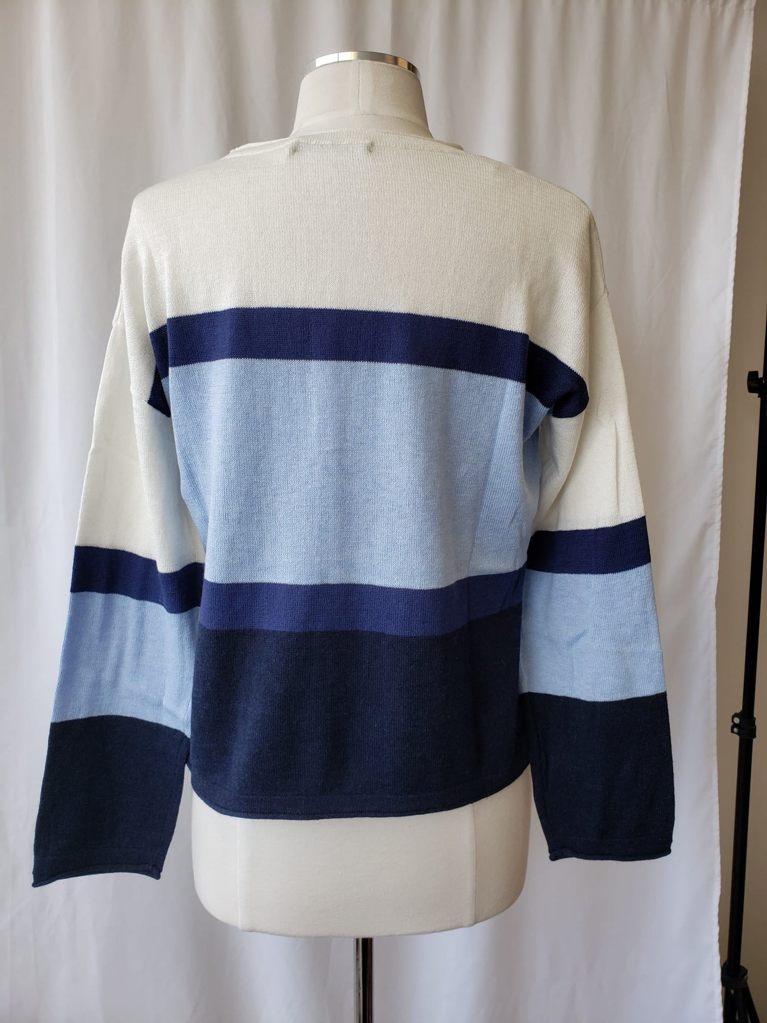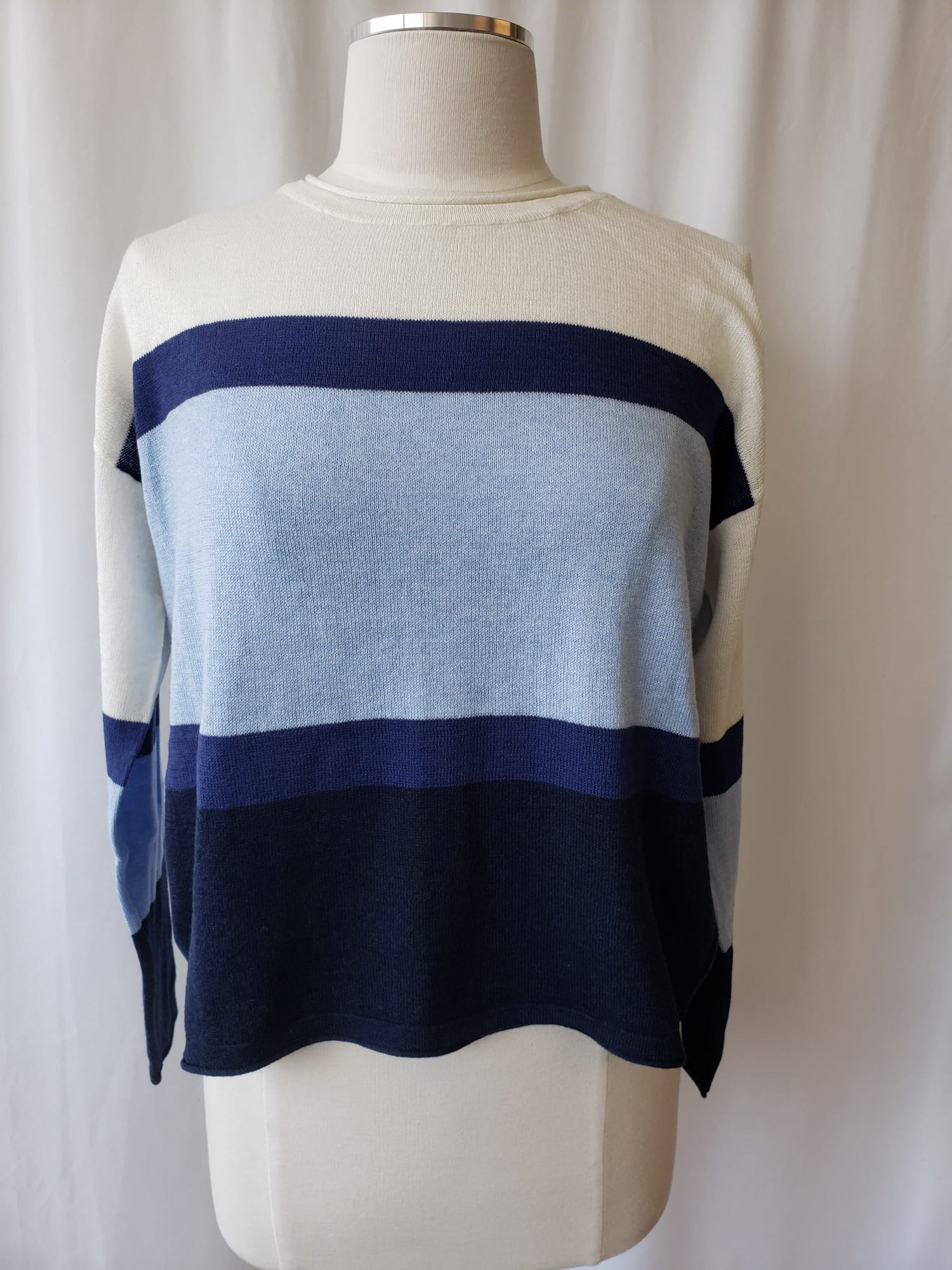 This crew neck sweater features blue colour blocks on the body and the sleeves.