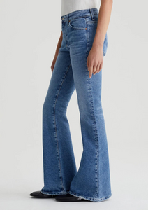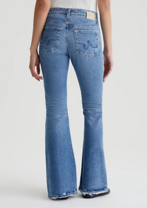 Angeline is a mid-rise jean with a dramatic flared silhouette. It's featured here in a faded light blue wash featuring slightly frayed hems and subtle distressing at the pockets. These mid-rise flare jeans come in 11 oz. 360° Denim with vintage bi-stretch construction for a flattering, comfortable fit.