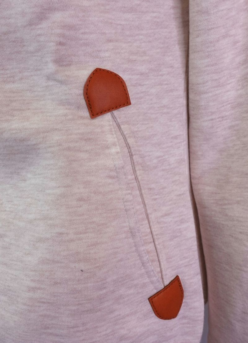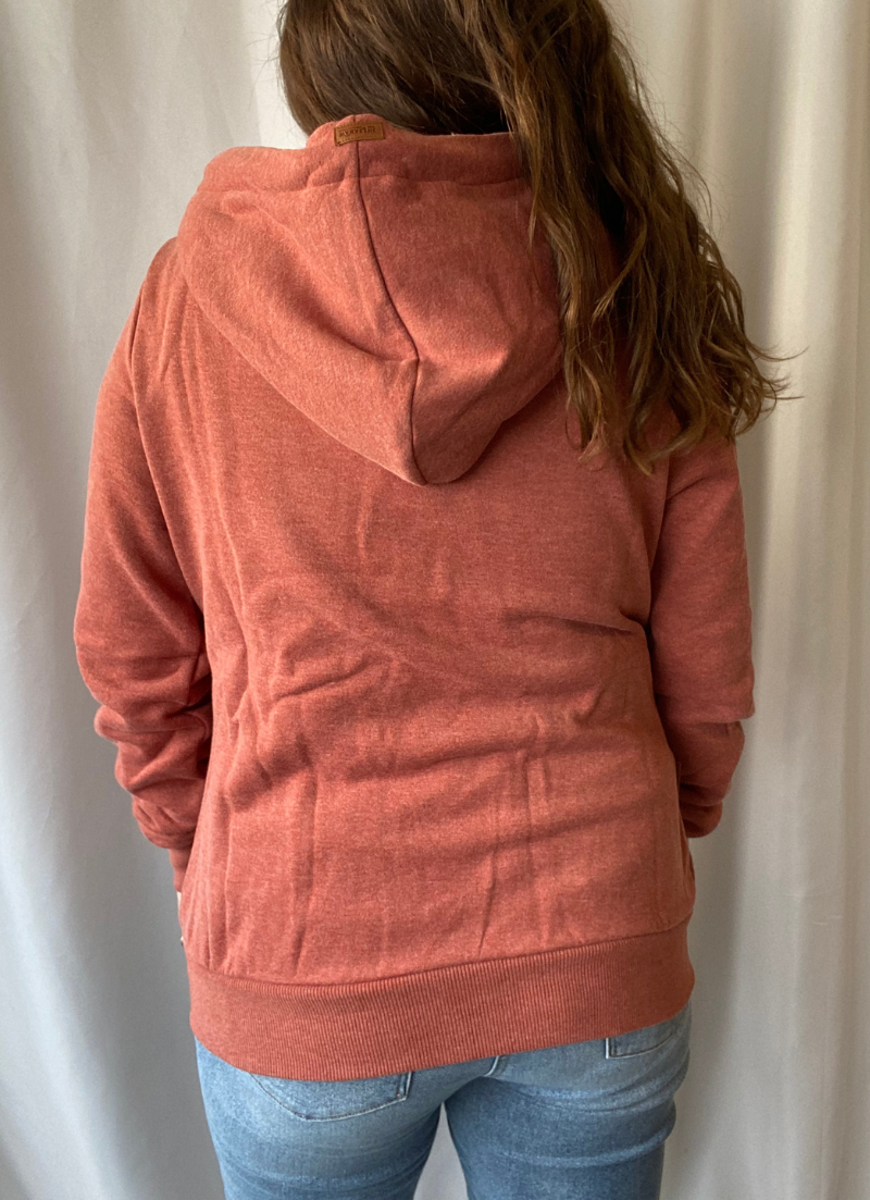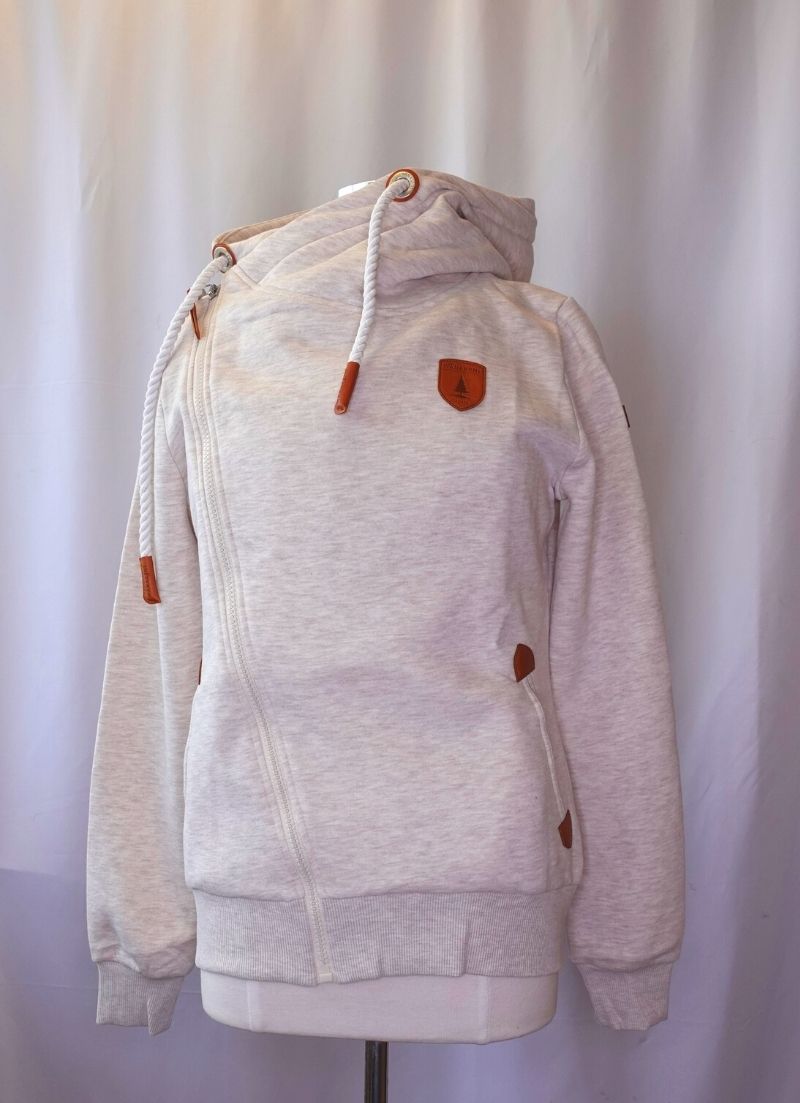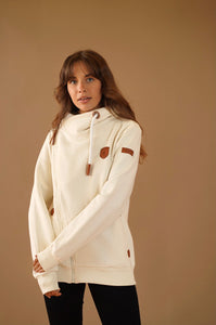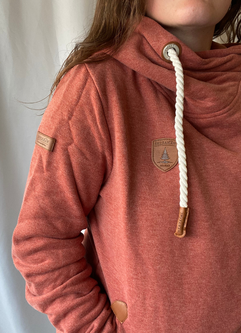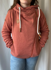 The Athena Hoodie features a cowl neck hood with adjustable rope drawstrings and vegan leather caps, two pockets, a brushed French terry interior and diagonal side zipper.
