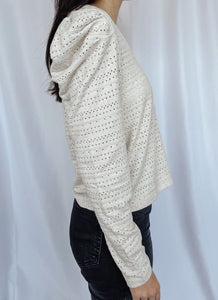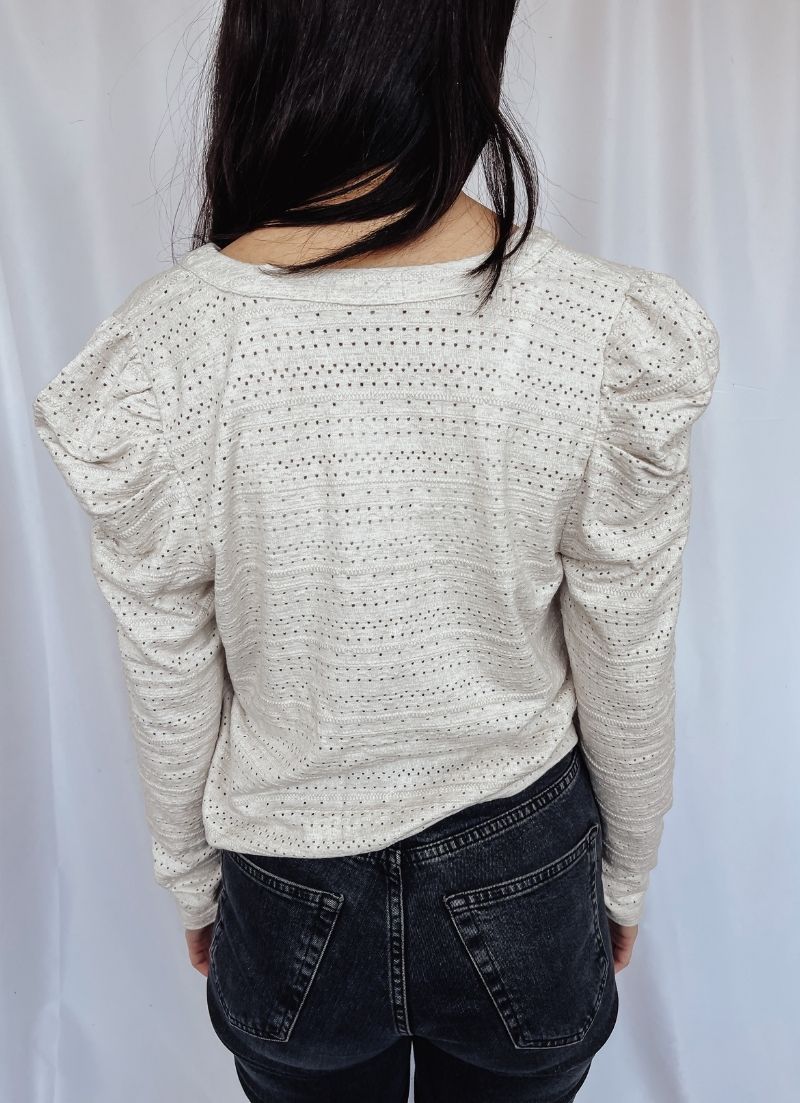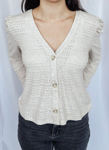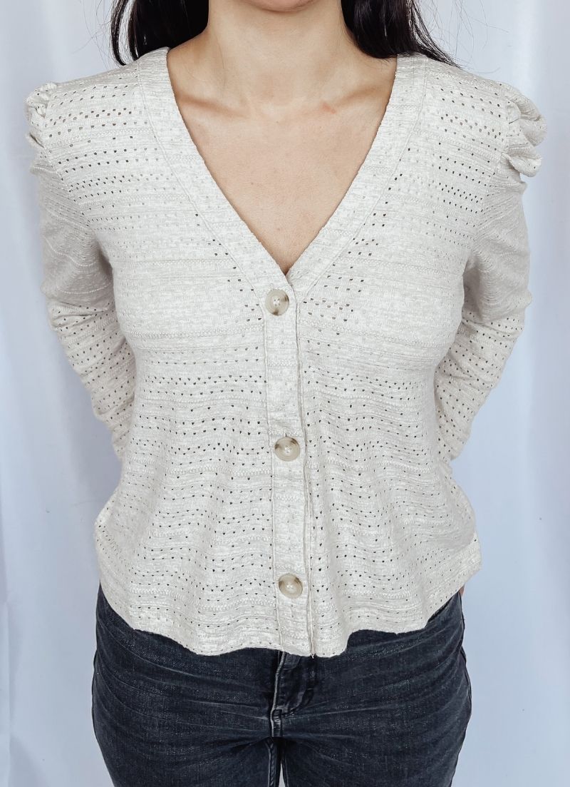 Button up cardigan with puff shoulders that can be worn on its own or layered with a top underneath.