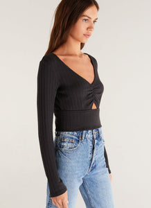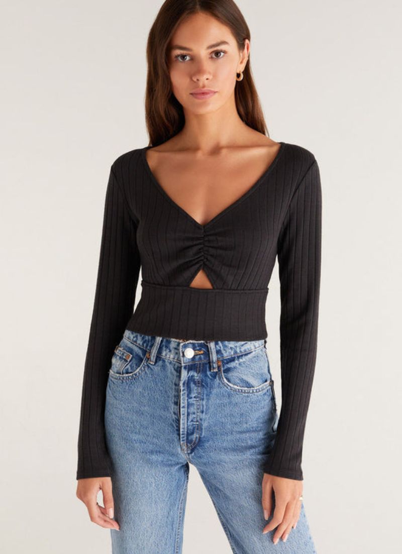 The Bella Rib Long Sleeve Top is made using a chunky wide rib fabric and has a fitted, cropped design. The v-neckline meets at a ruched peekaboo opening that's fun, flirty and flattering! The fitted sleeves elevate this long sleeve and the hem hits above the waistband, perfect for pairing with high rise styles.