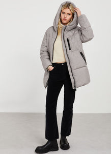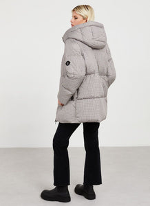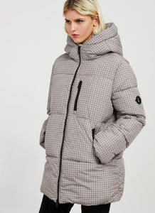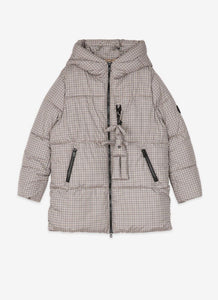 A waterproof tweed puffer jacket with long sleeves, inner cuffs and hood. Contrasting zip fastening on front and pockets and contrasting embroidered logo. Comes with a matching mascot bunny with detachable hook.
