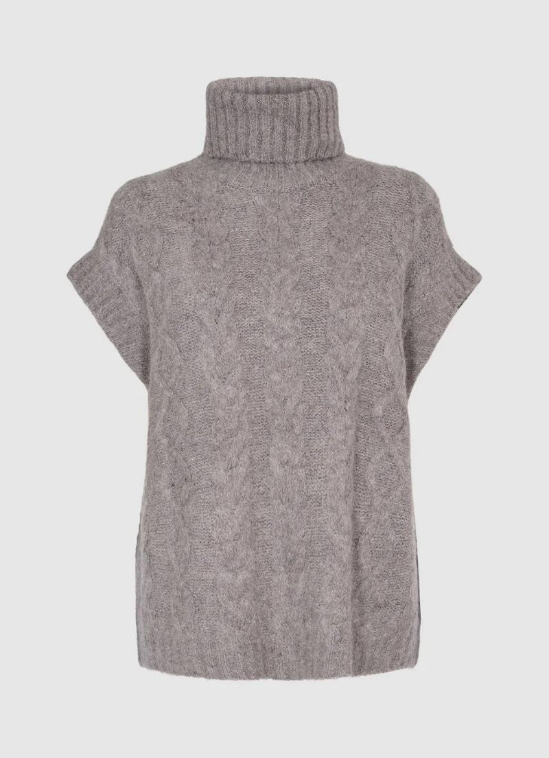 Cablina is a knitted waistcoat with a loose fit and features roll-neck, rib edges and dropped shoulders. It is detailed with a knitted pattern.