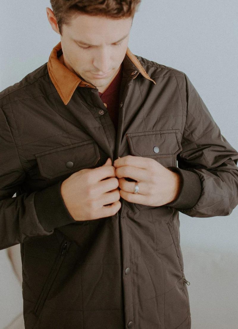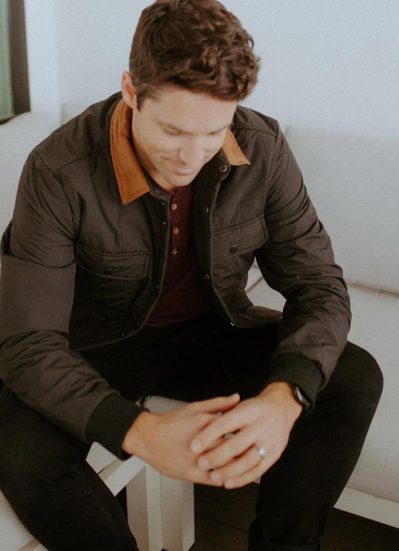 We've got the perfect light weight fall jacket for you. Patch pockets, quilted texture and a vegan suede collar that pops for added detail. Hello, Handsome!