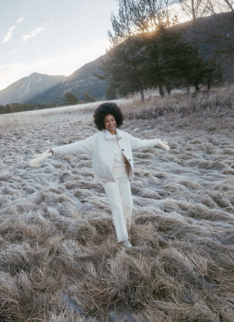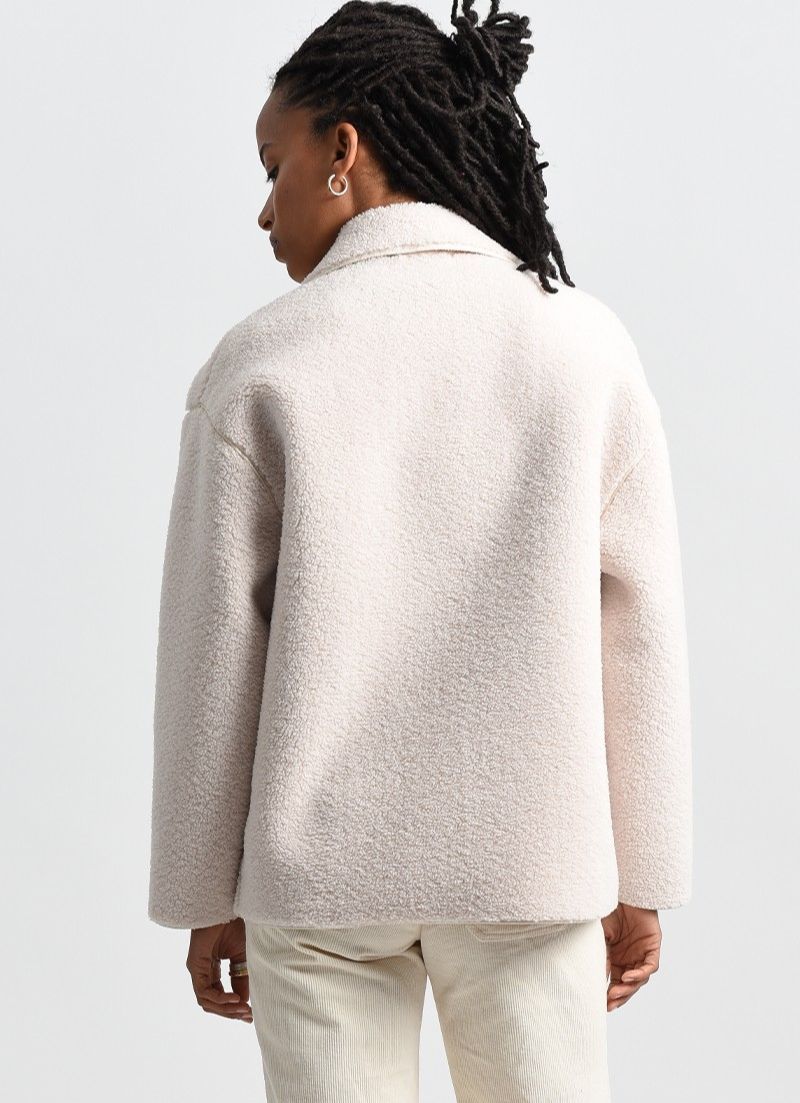 The urban elegance in winter season...This coat features a spread collar, long wide sleeves, front button closures, side patch pockets and an all over faux sherling.