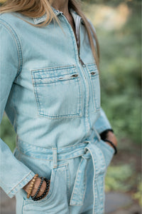 Get ready to turn heads in the playful and stylish Celia Jumpsuit! Made from soft denim, this jumpsuit features convenient front and bust pockets, a flattering drawstring waist, and a charming heart appliqué on the back. Perfect for any occasion, this jumpsuit is a must-have for your wardrobe.