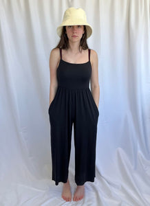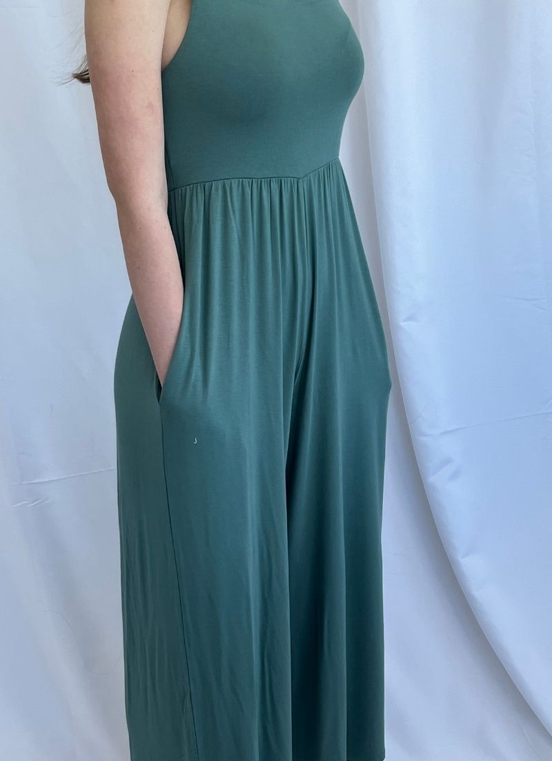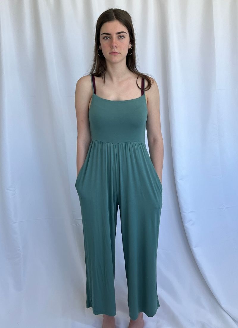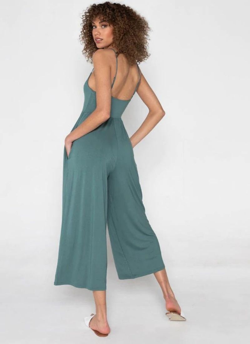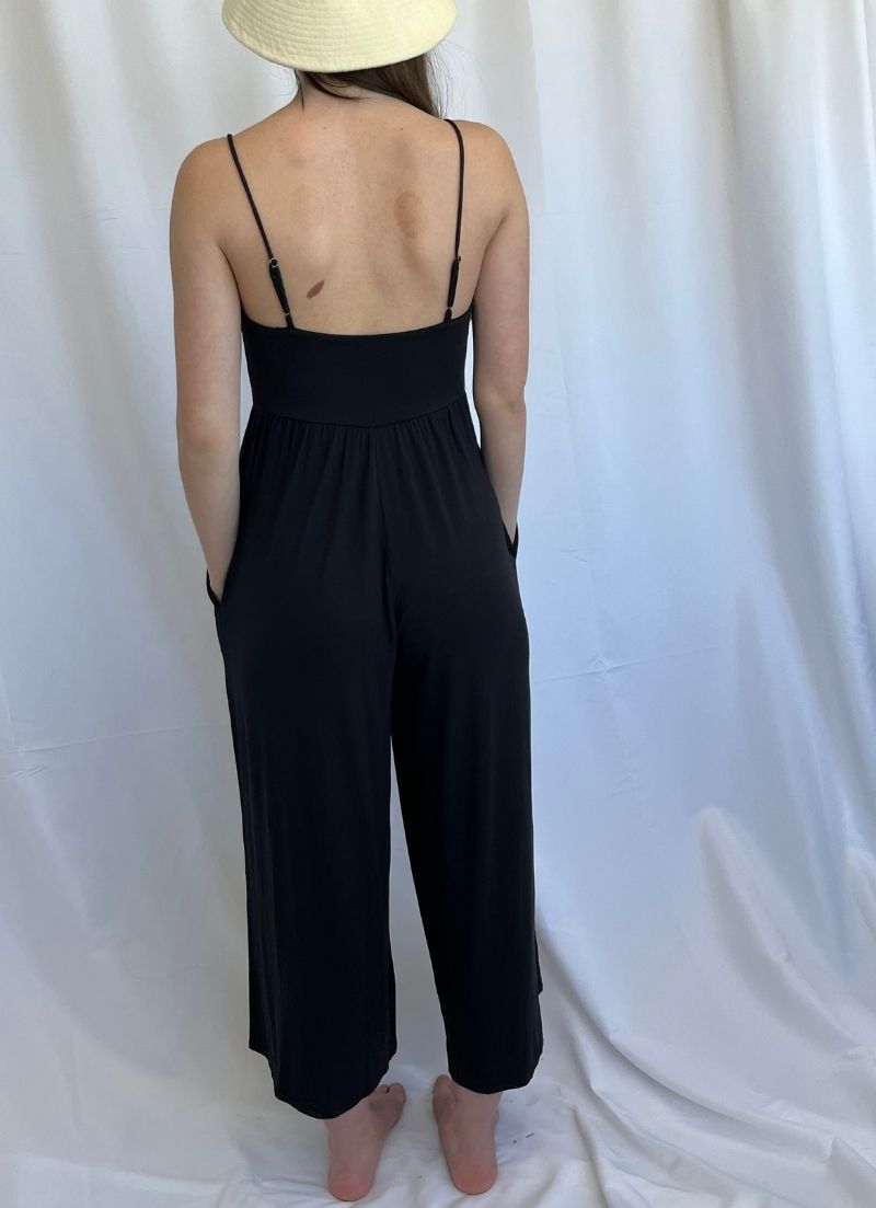 A wide leg, spaghetti strap jumpsuit with pockets.