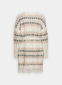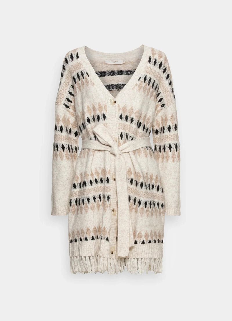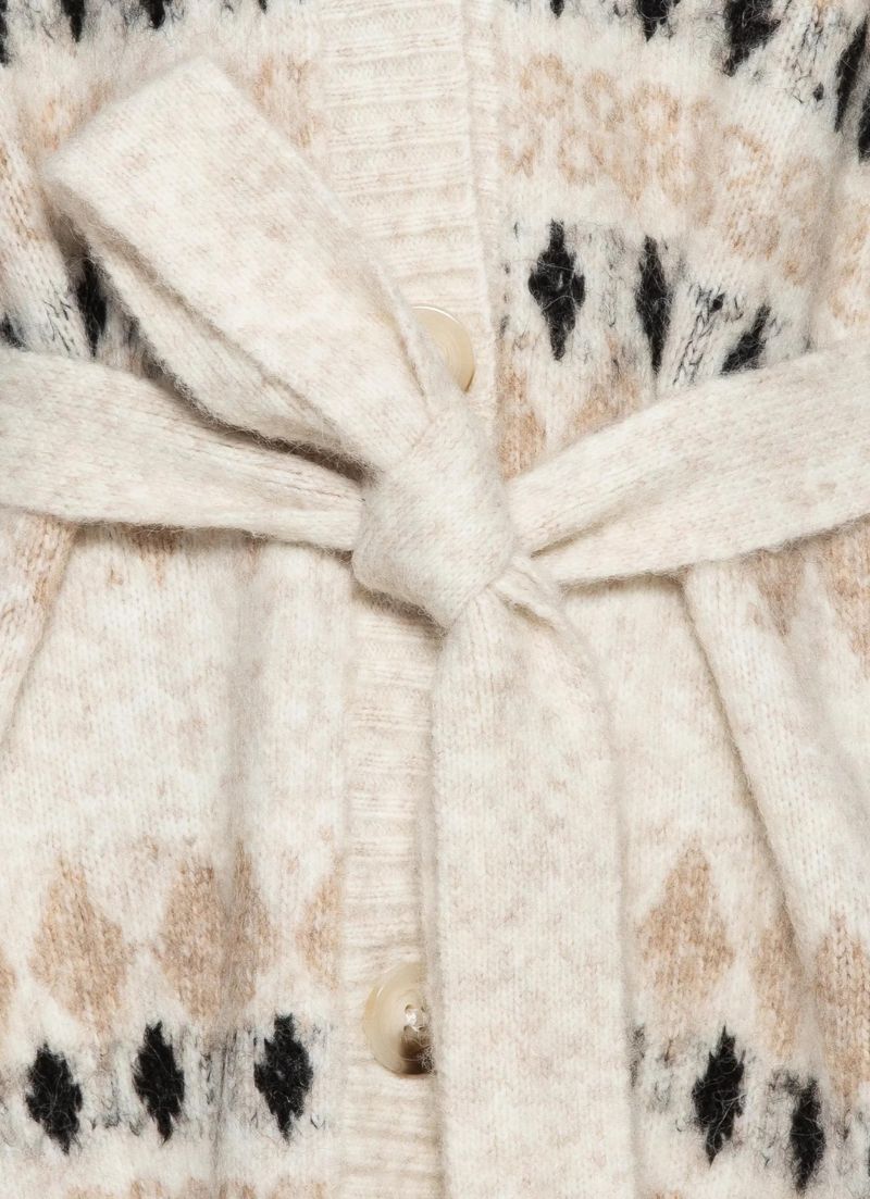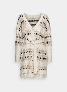 The Cherry knit cardigan is a long cardigan with a V neckline and a waist belt.