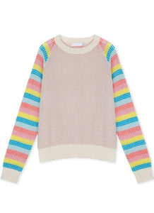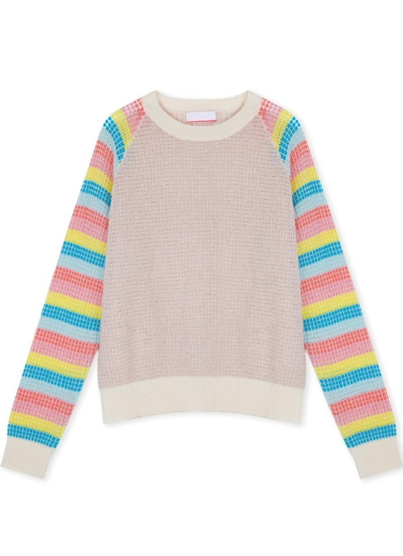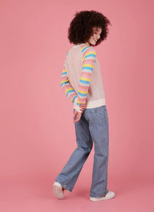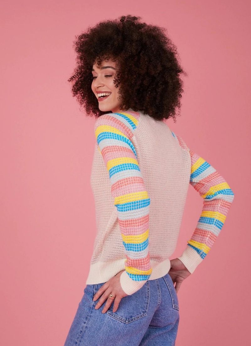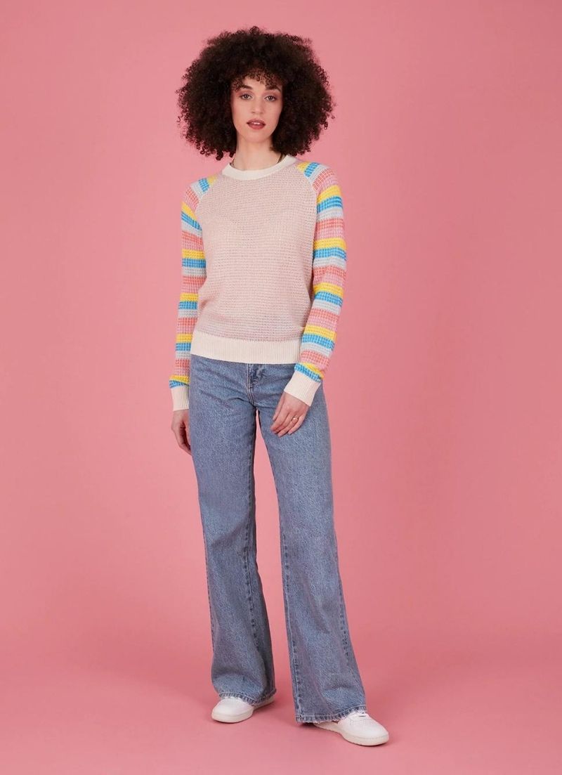 The Maeve sweater is both colourful and calm, with brighter striped sleeves and a muted pink for the body. Featuring raglan sleeves and a boxy fit, with a tucked stitch design to give the jumper more texture.