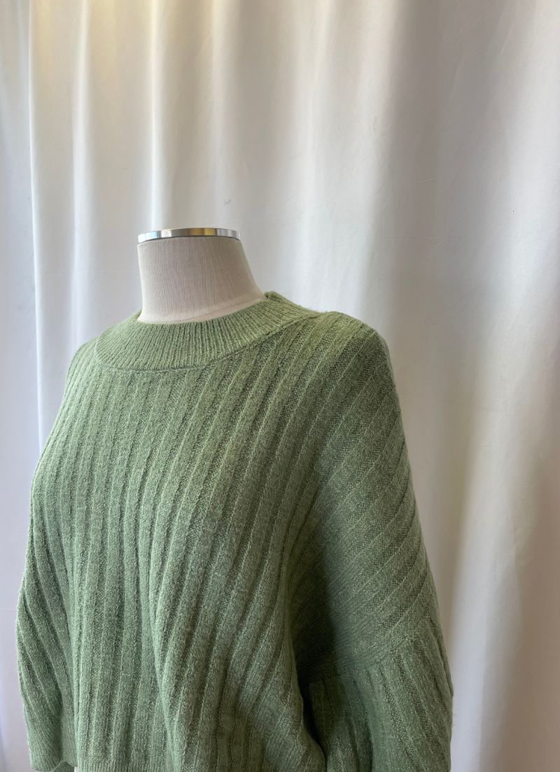 A crop sweater featuring a higher neckline, rib detailing and balloon sleeves.