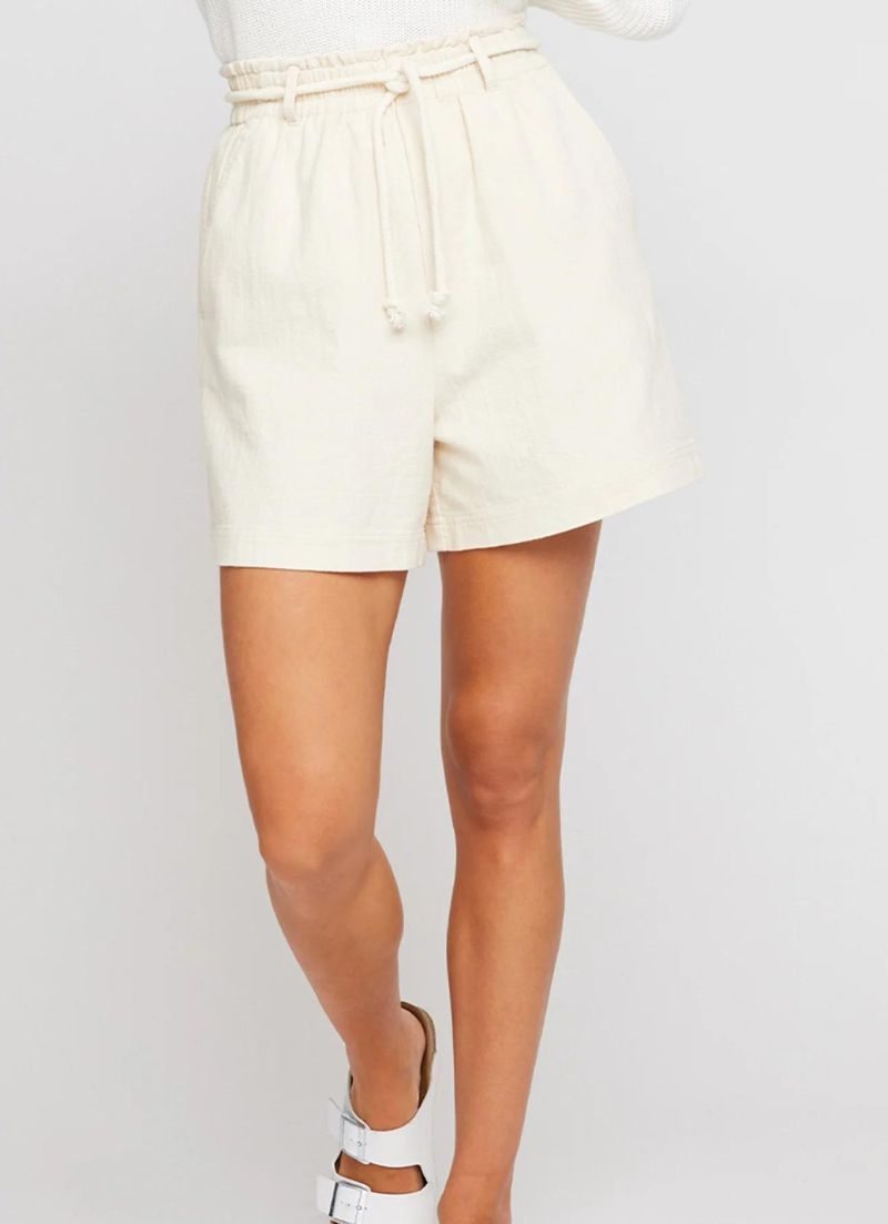 The Cybil short is made of a textured fabric that has been washed for a perfectly lived in look and feel. Features include an elasticated waistband with a high rise, removable rope belt, and slash pockets.