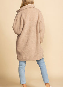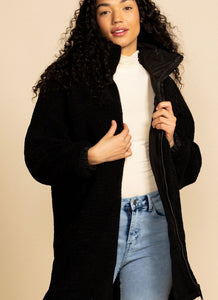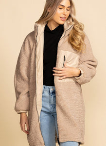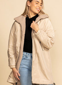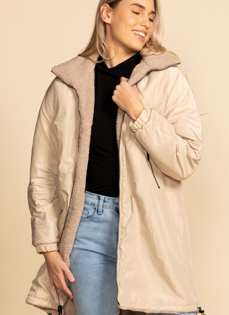 This amazing Sherpa is a reversible coat. If it rains, reverse to nylon shield on the outside and cozy sherpa on inside. This coat features pockets both ways!
