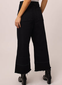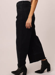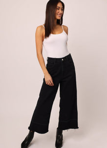 Super high rise cropped wide leg jeans. It's the vivacious fit that sits at natural waist and relax fitting in the hips and thigh. Cropped inseam on black weft super stretch denim in rich indigo shade accented with wide released hem details, frayed hem leg opening, back darts for lift support, tailored press center seam lines.