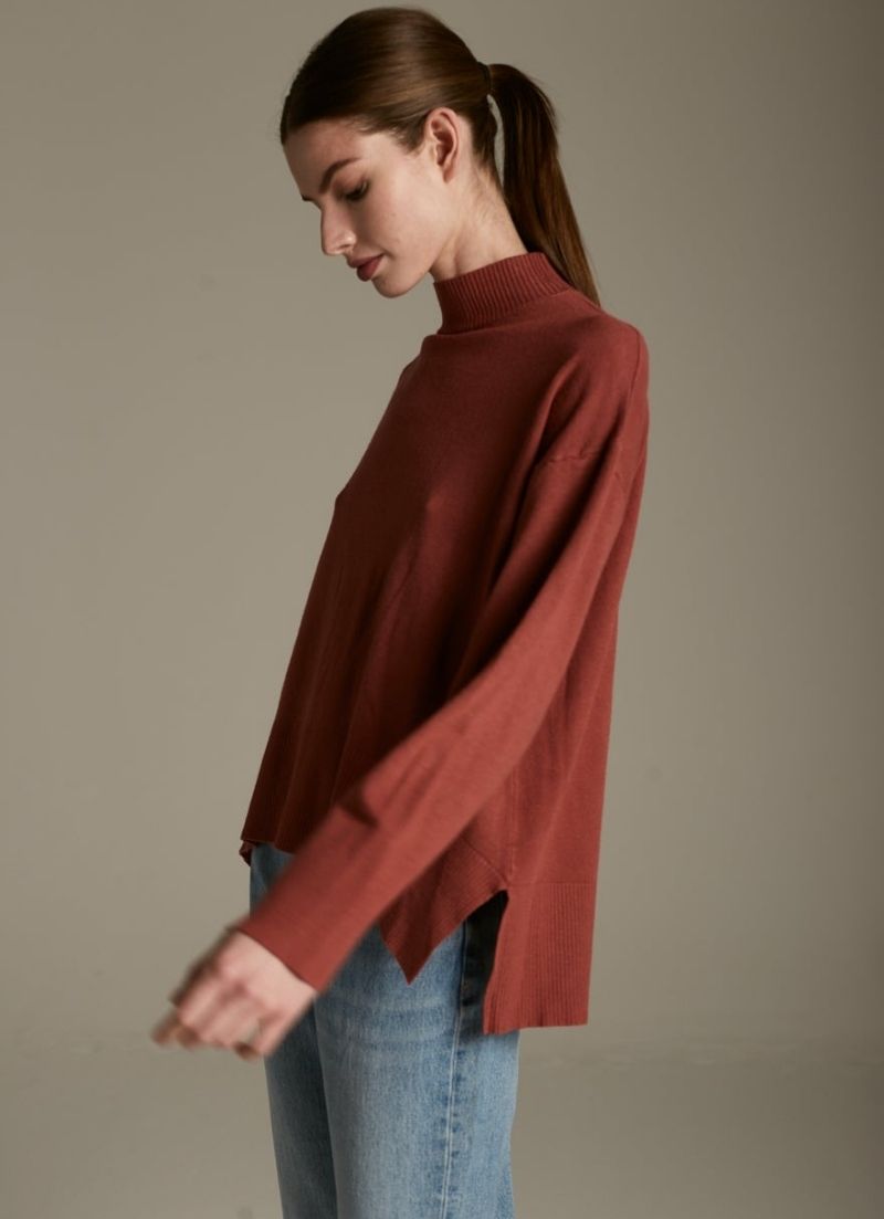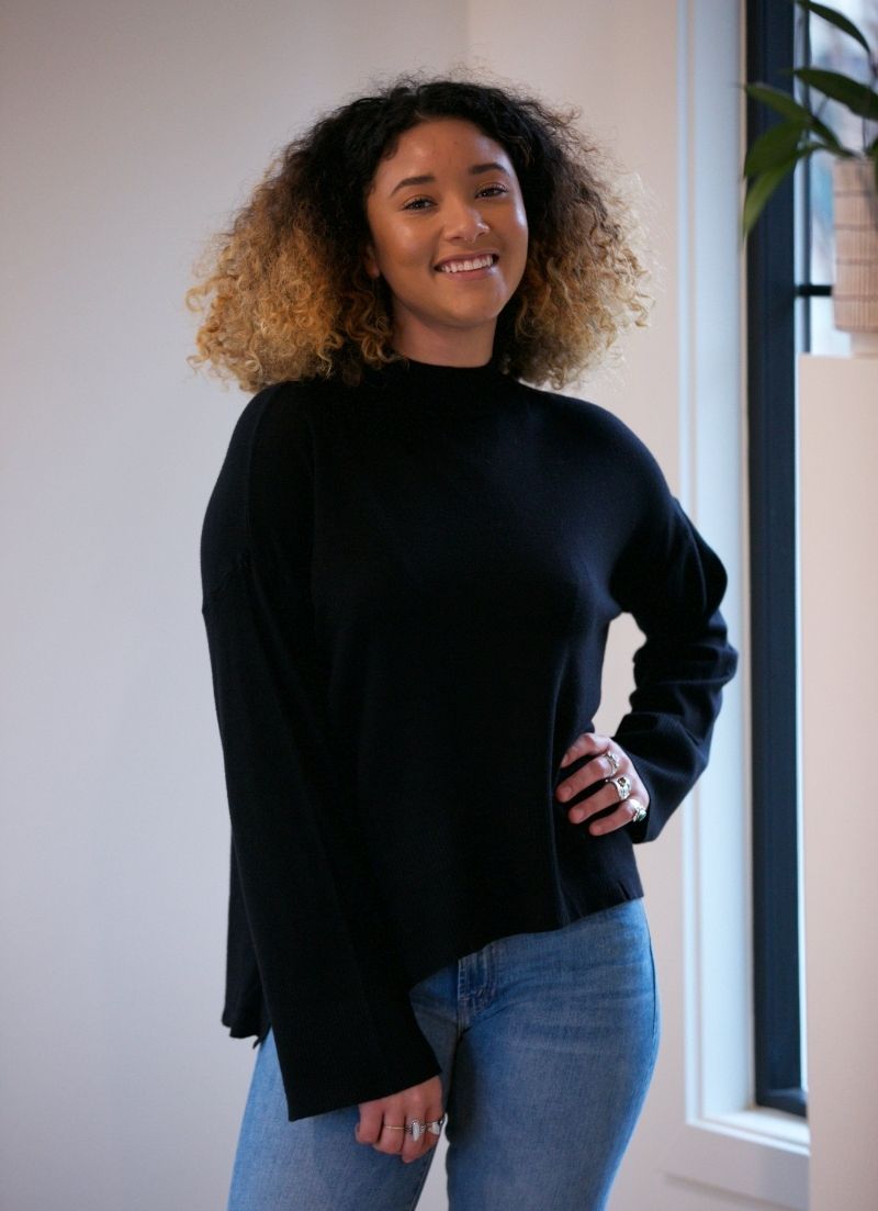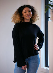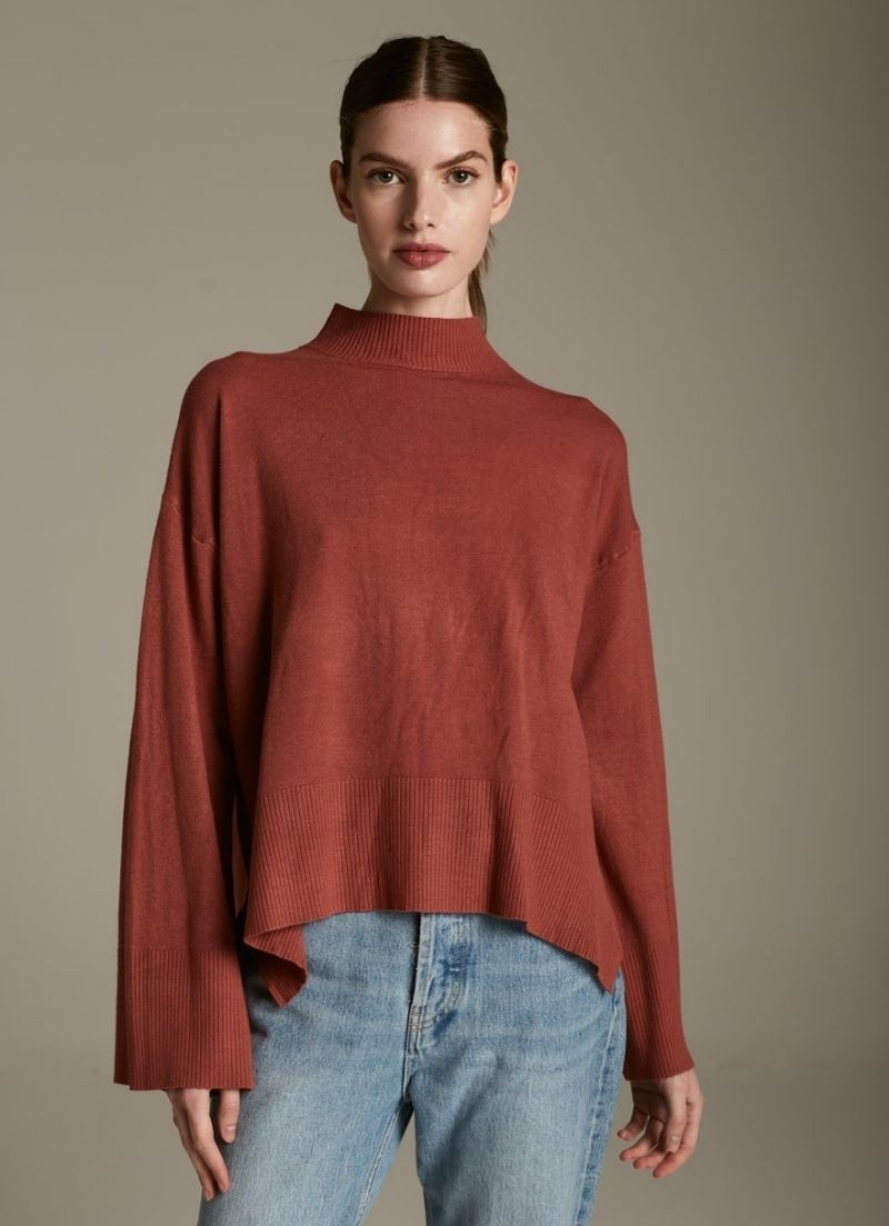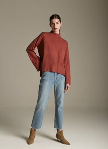 The Kathy Sweater features a half turtleneck and wide, flowy cuffs for a beautiful draped look.